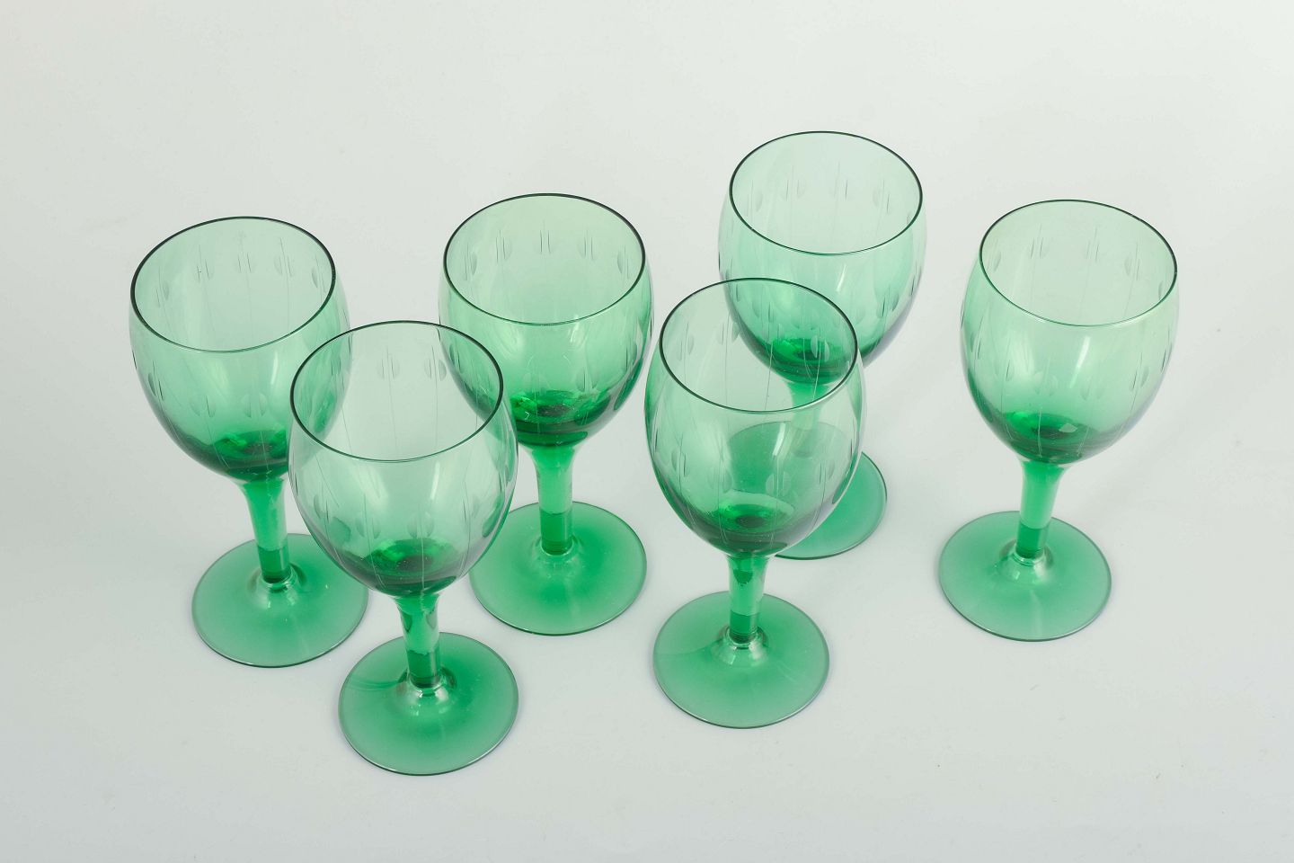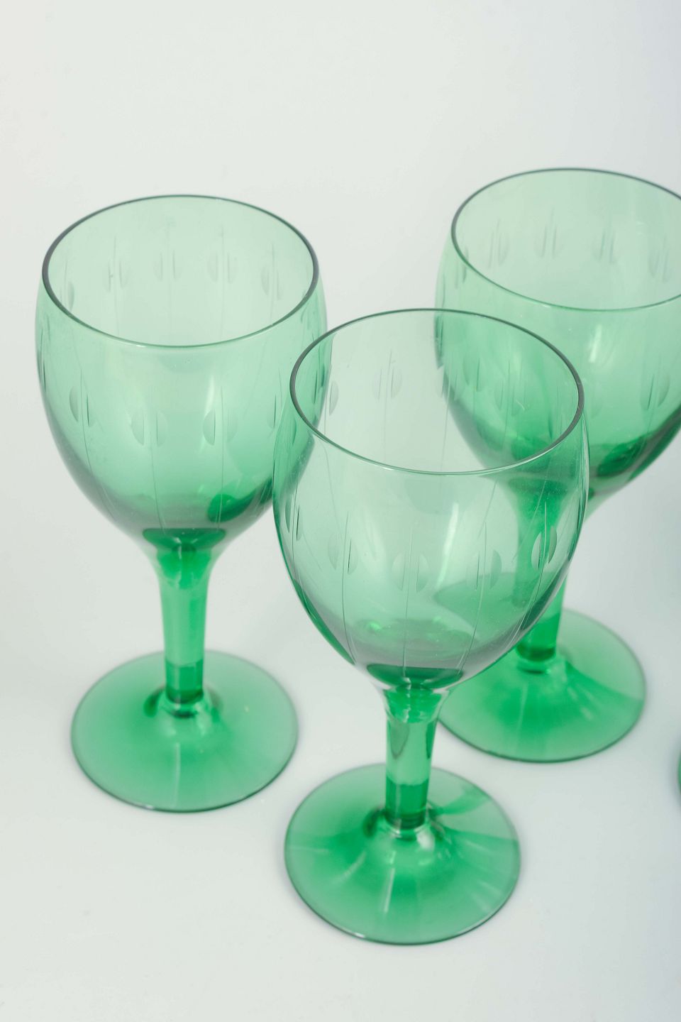 Sæt med seks grønne hvidvinsglas i det klassiske Kirsten Piil-design for Holmegaard. De elegante glas har en let organisk form og et smukt, transparent grønt farvespil, der giver et tidløst og stilrent udtryk.