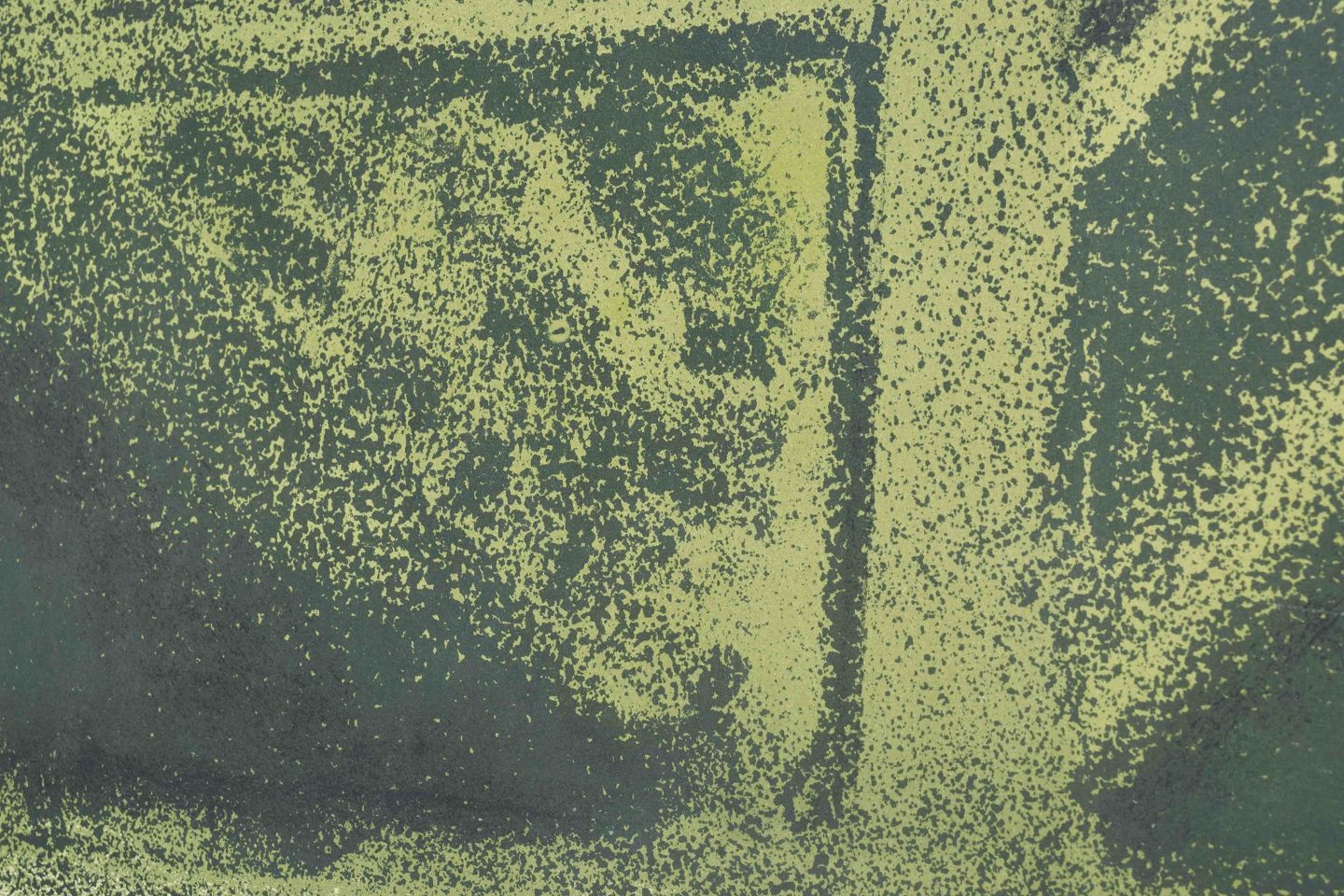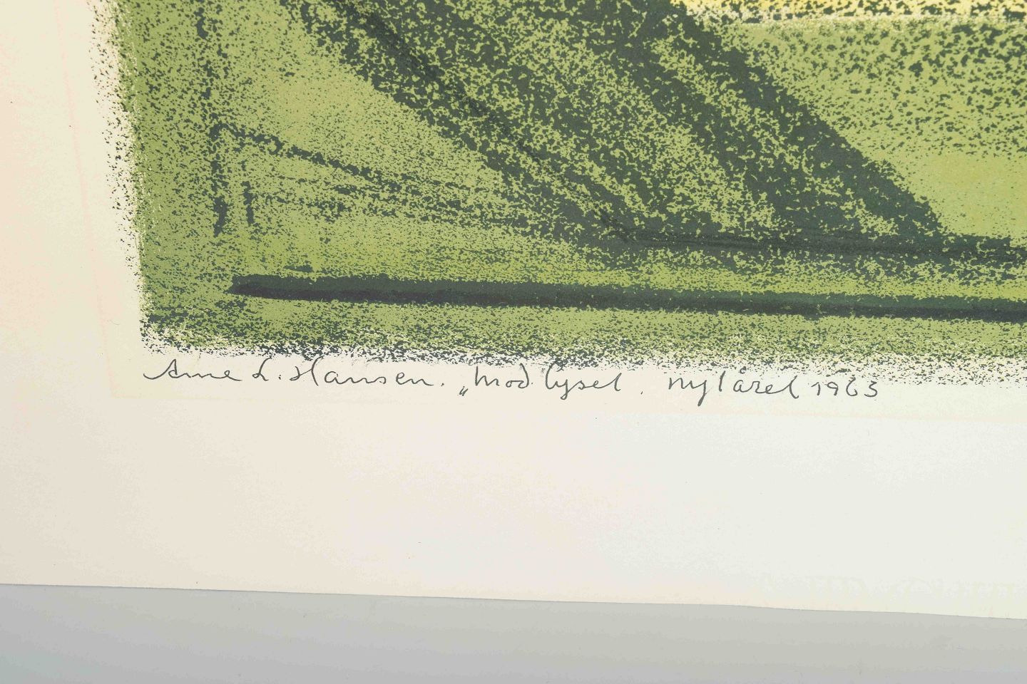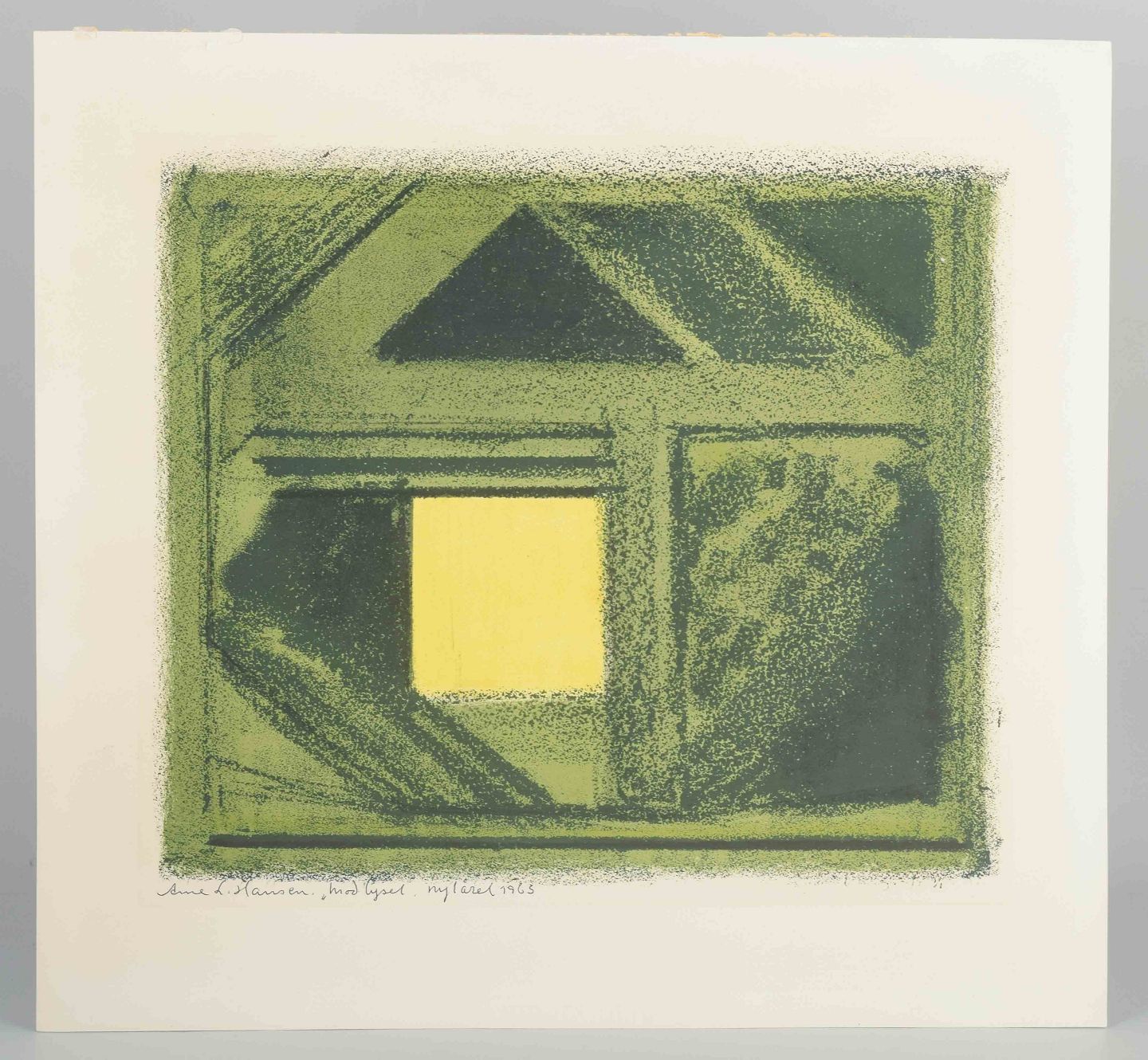 Abstrakt komposition med geometriske felter i grønne nuancer, hvor et centralt gult kvadrat skaber en markant kontrast og fremhæver værkets titel “Mod lyset”. Trykket rummer Arne L. Hansens karakteristiske fornemmelse for lys, struktur og stoflighed, som kendes fra hans arbejde både som maler og grafiker.