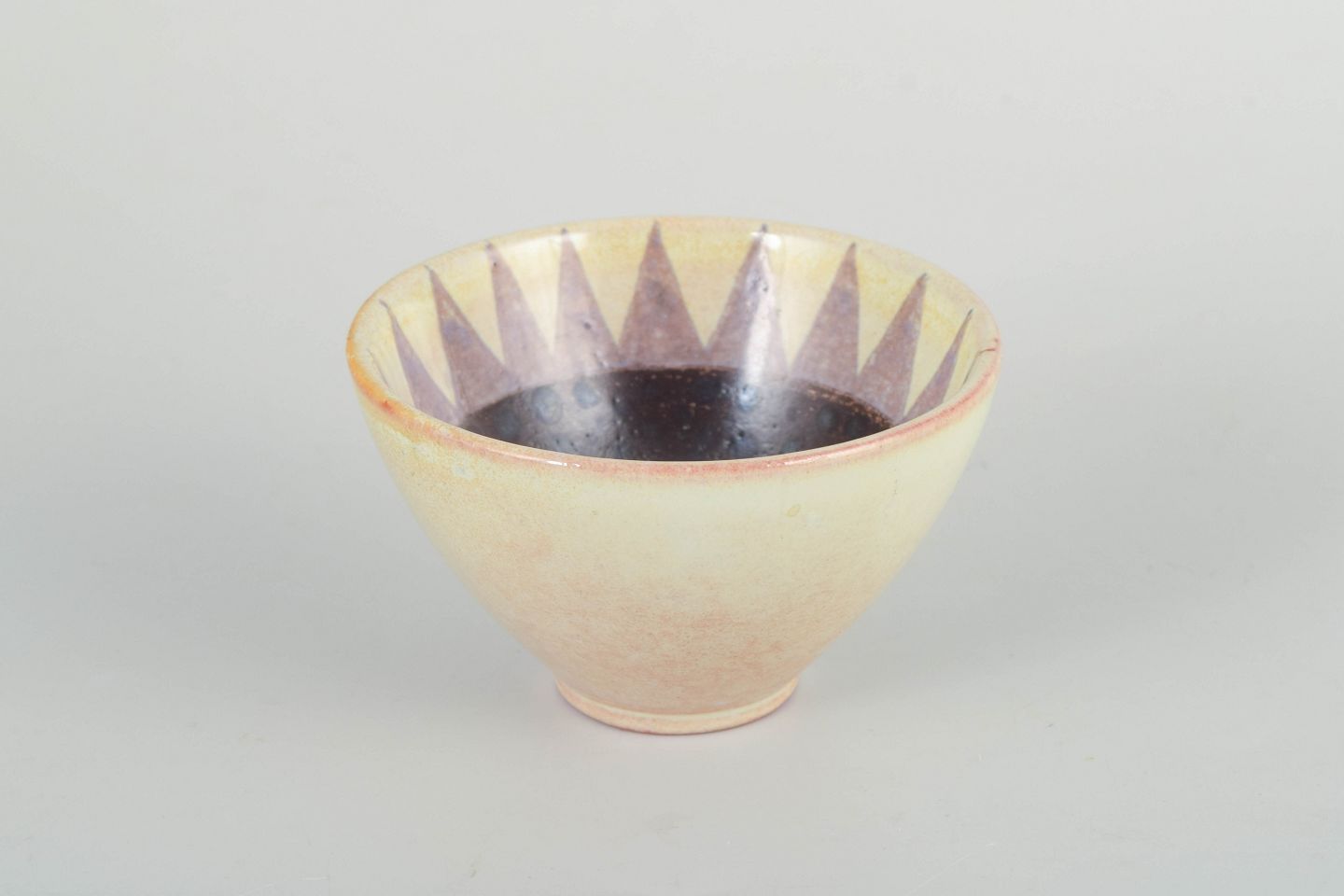 Organisk formet skål i drejet stentøj med lys ydre glasur i rosa/hvide toner og indvendigt dekoreret med mørk glasur samt trekantmønster i brune nuancer.