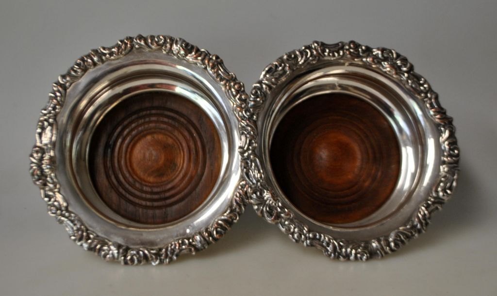 Par engelske vin bakker, forsølvet kobber, 20. årh. Med træbund. Kant med dekoration. H: 5,4 cm. Dia.: 15 cm.