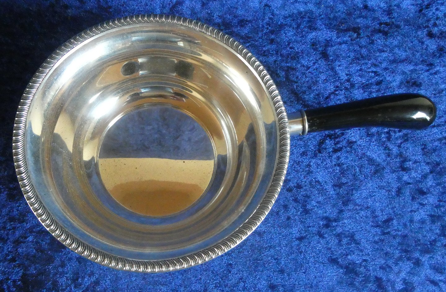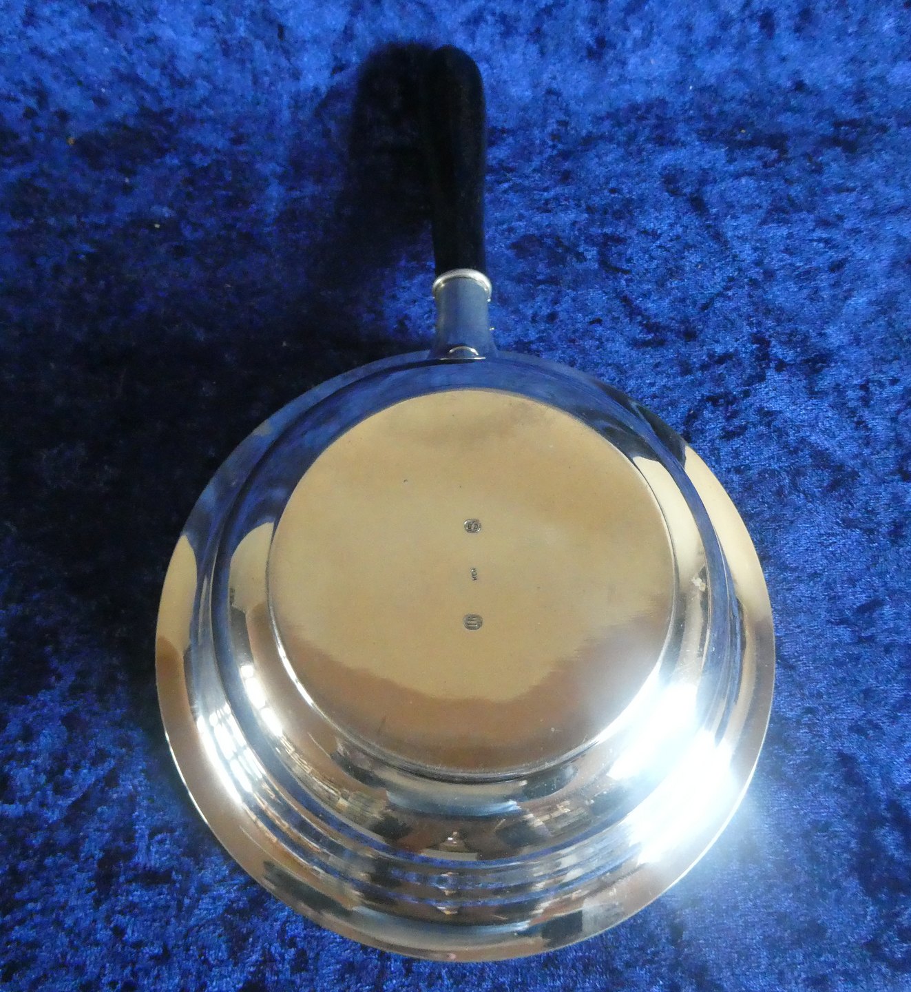Kasserolle eller stor skål i tretårnet sølv med sort træhank fra 1934, pæn og velholdt. Fremstillet af sølvsmed K.C. Hermann, København. Københavner stempel med årstal 34, KCH for K.C. Hermann og guardein "JS" for Jens Sigsgaard (1932-1960).