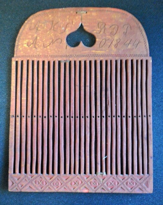 Antik dansk væve spjæld i rødmalet bemalet bøg, 1844.  Med karvsnit. Med udskåret hjerte og intivalerne: A.K.S / R.D.J. 27,5 x 21.5 cm.