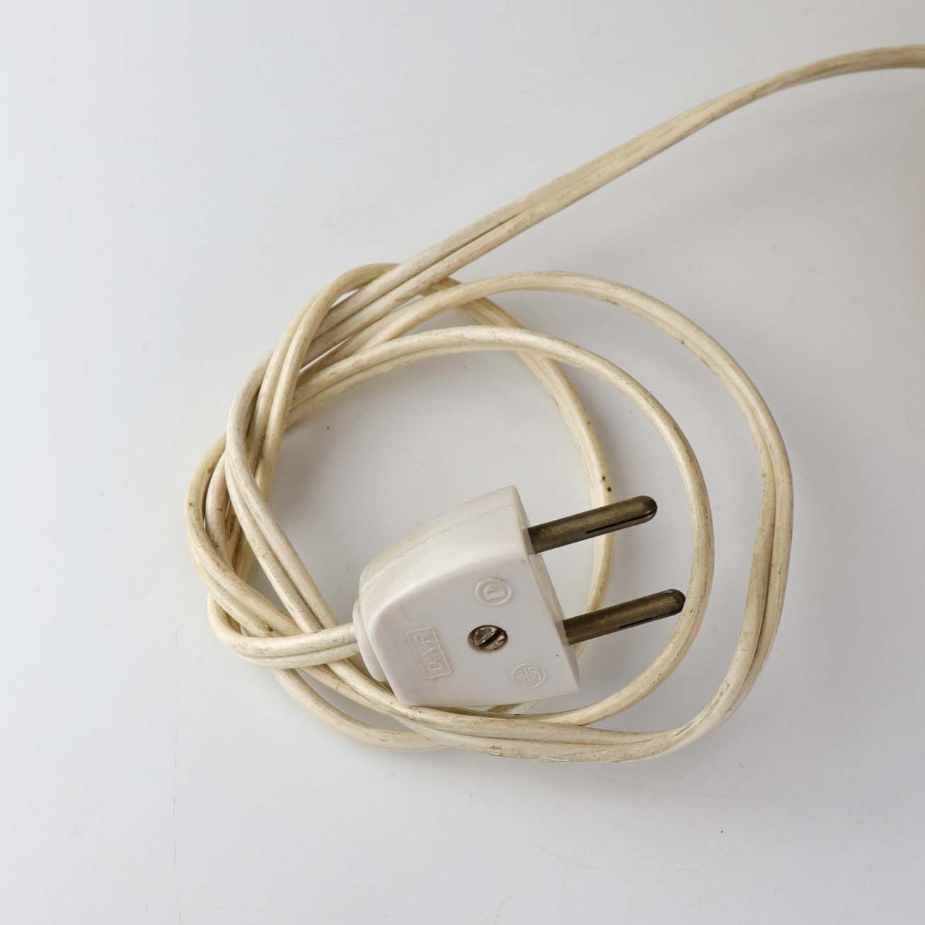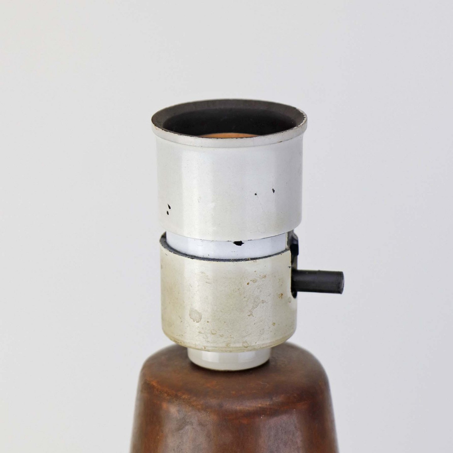 Lampefod i stentøj med gyldenbrun glasur og dekoration af sol. Ledningen er opbevaret i foden. Nr. 1203-4