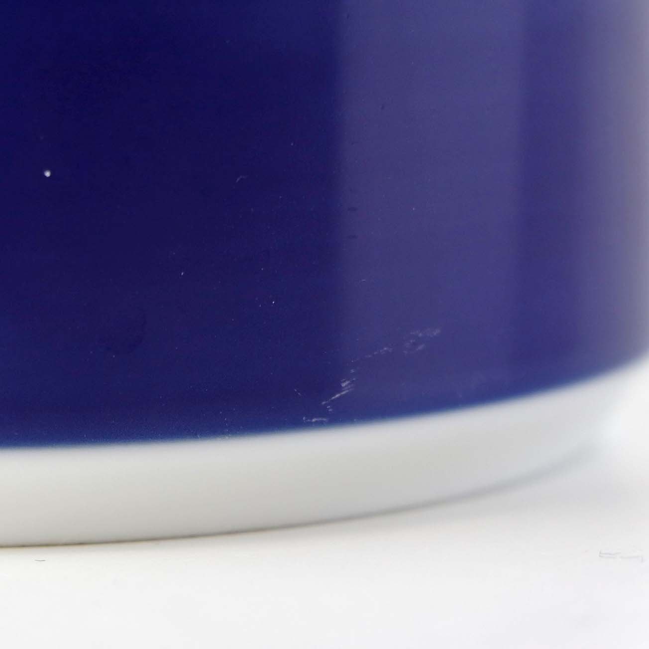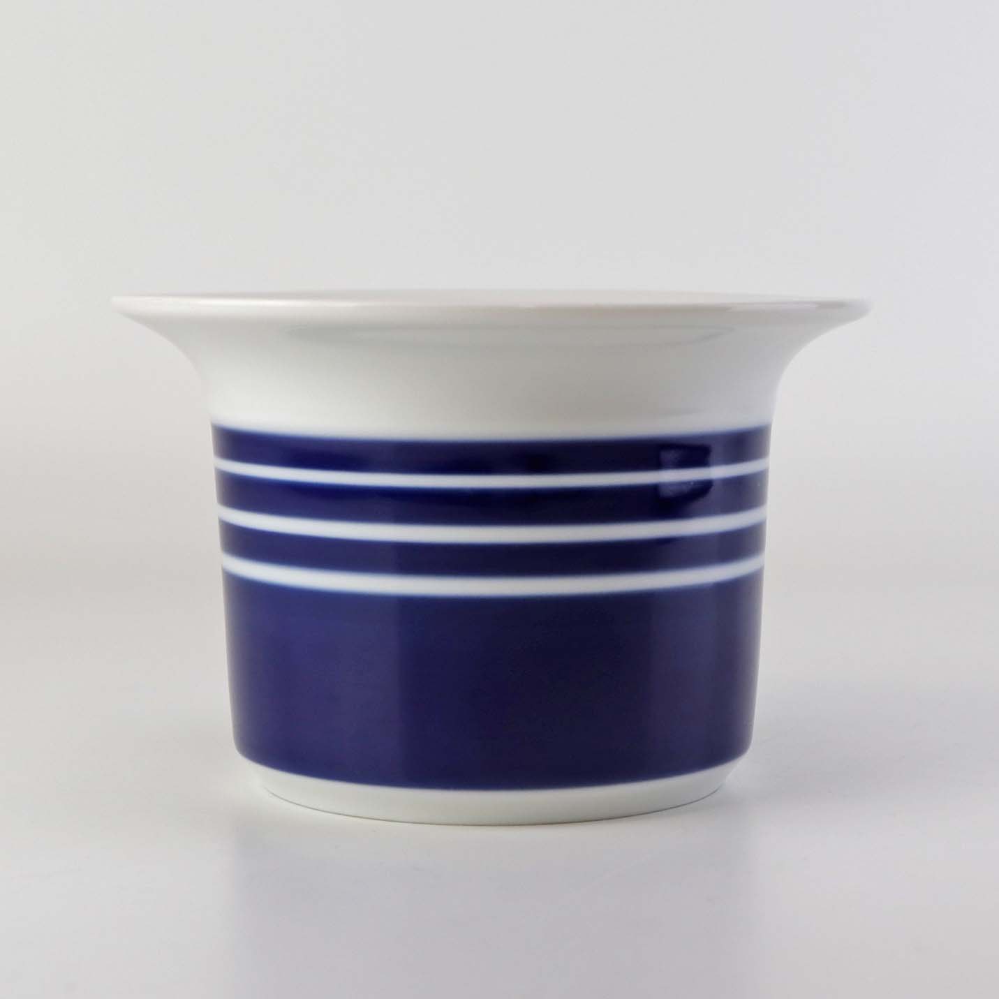 Lille urtepotteskjuler i glat hvidt porcelæn dekoreret med blå striber. Nr. 1855/6102