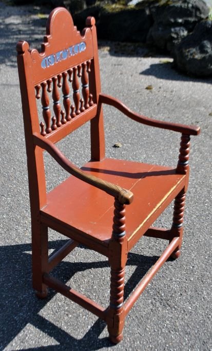 Armchair of painted beech wood 1812. Denmark. Painted red. 5-part slatted back. The back is carved with the initials: DN DK 1812. H.: 106 cm. W.: 67 cm. D.: 39.5 cm.