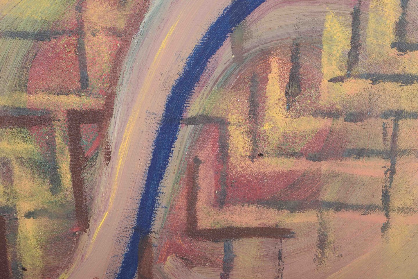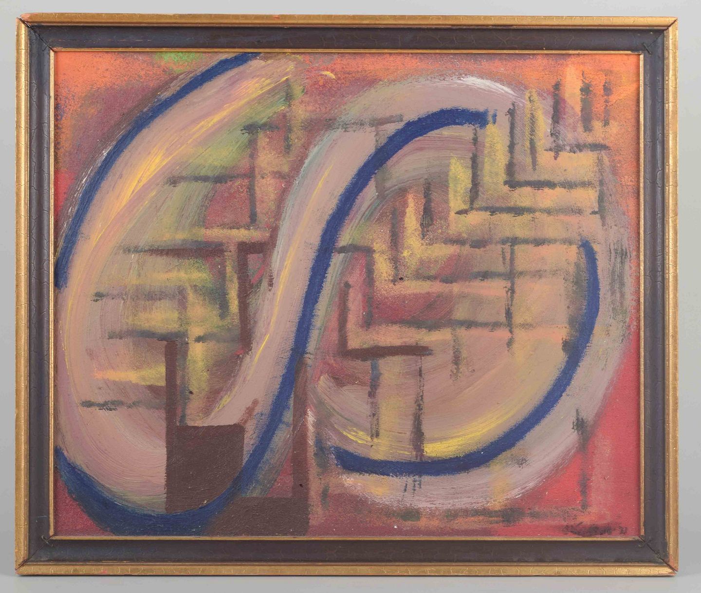 Et farverigt og geometrisk-abstrakt maleri, hvor organiske og lineære former krydser hinanden i et spil af blå, gule og rødlige nuancer. Den centrale bølgende form deler billedfladen og skaber en rytmisk kontrast til baggrundens netværk af kantede strukturer.