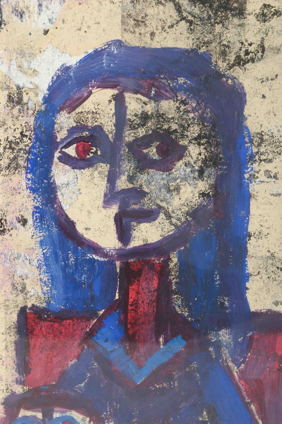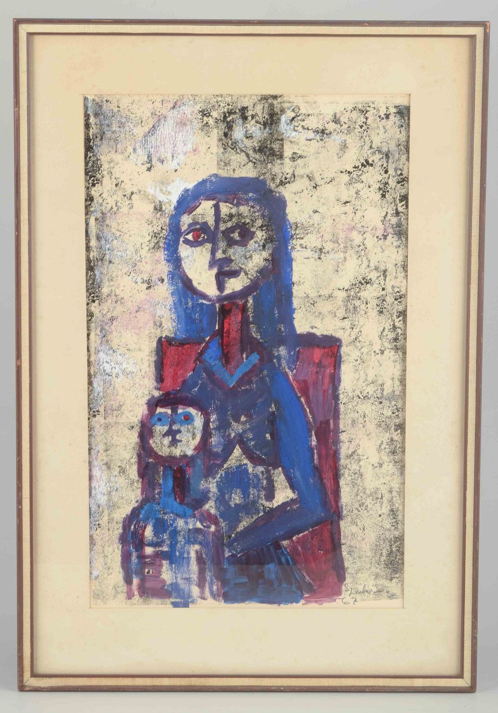 An expressive figurative work in strong blue and red tones, depicting the mother figure and child with bold contours and a raw, almost iconic formal language. The painting reflects the experimental approach to color and form of the 1960s, radiating both intensity and intimacy.