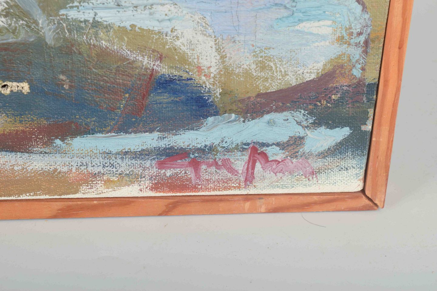 Et modernistisk landskabsmaleri med vinterscene, der skildrer sneklædte marker og en kold himmel i en struktureret og farverig komposition. Værket afspejler Johanssons følsomhed for farve og form i en nordisk kontekst.