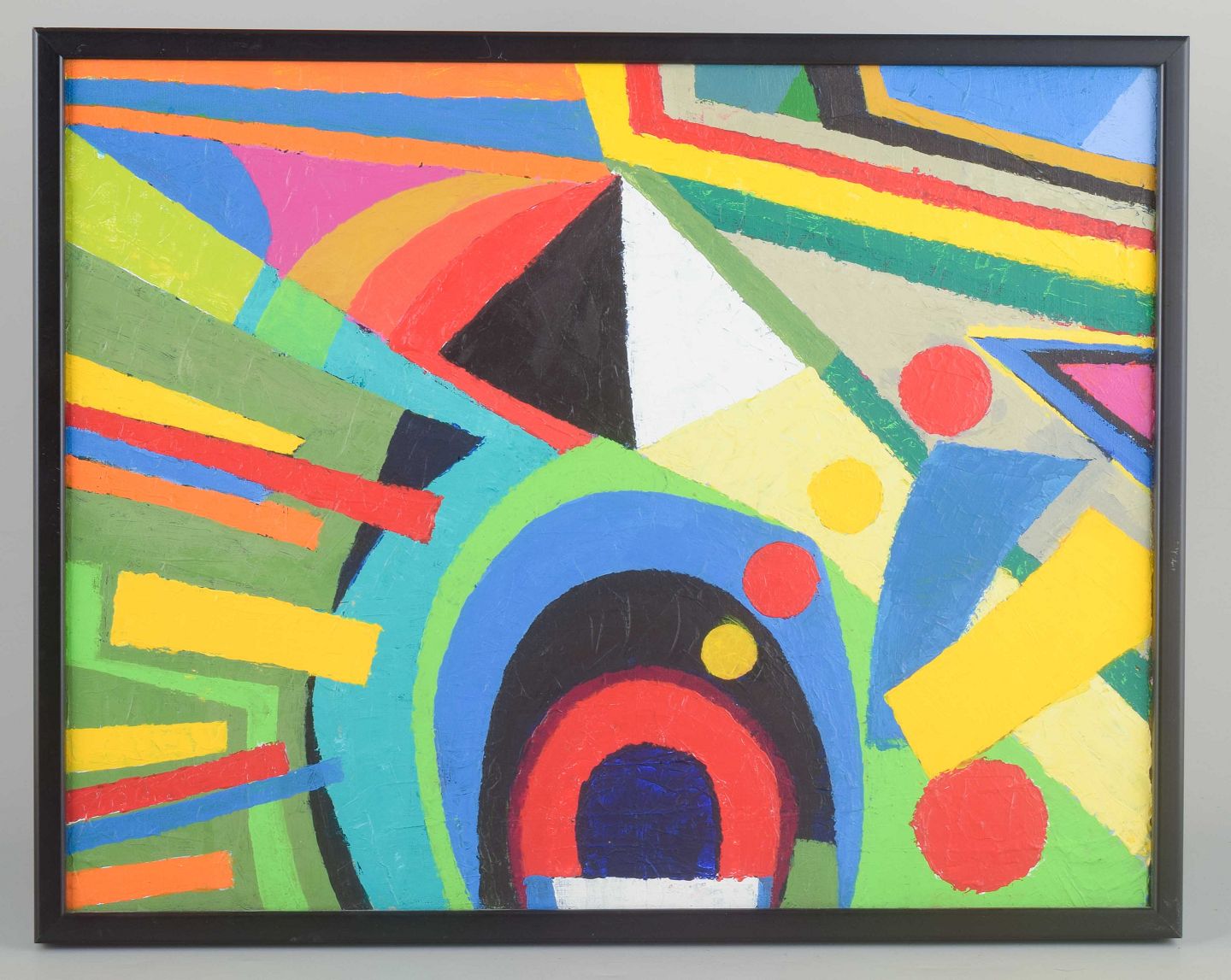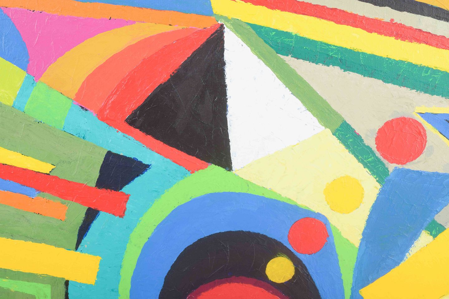 Et koloristisk stærkt og geometrisk præcist værk, hvor cirkler, buer og linjer i klare primær- og sekundærfarver danner en dynamisk helhed. Kompositionen bærer præg af 1970’ernes konkrete og konstruktivistiske billedsprog, hvor farve og form er de centrale udtryksmidler.