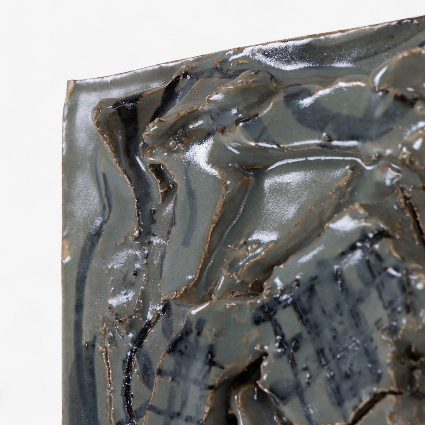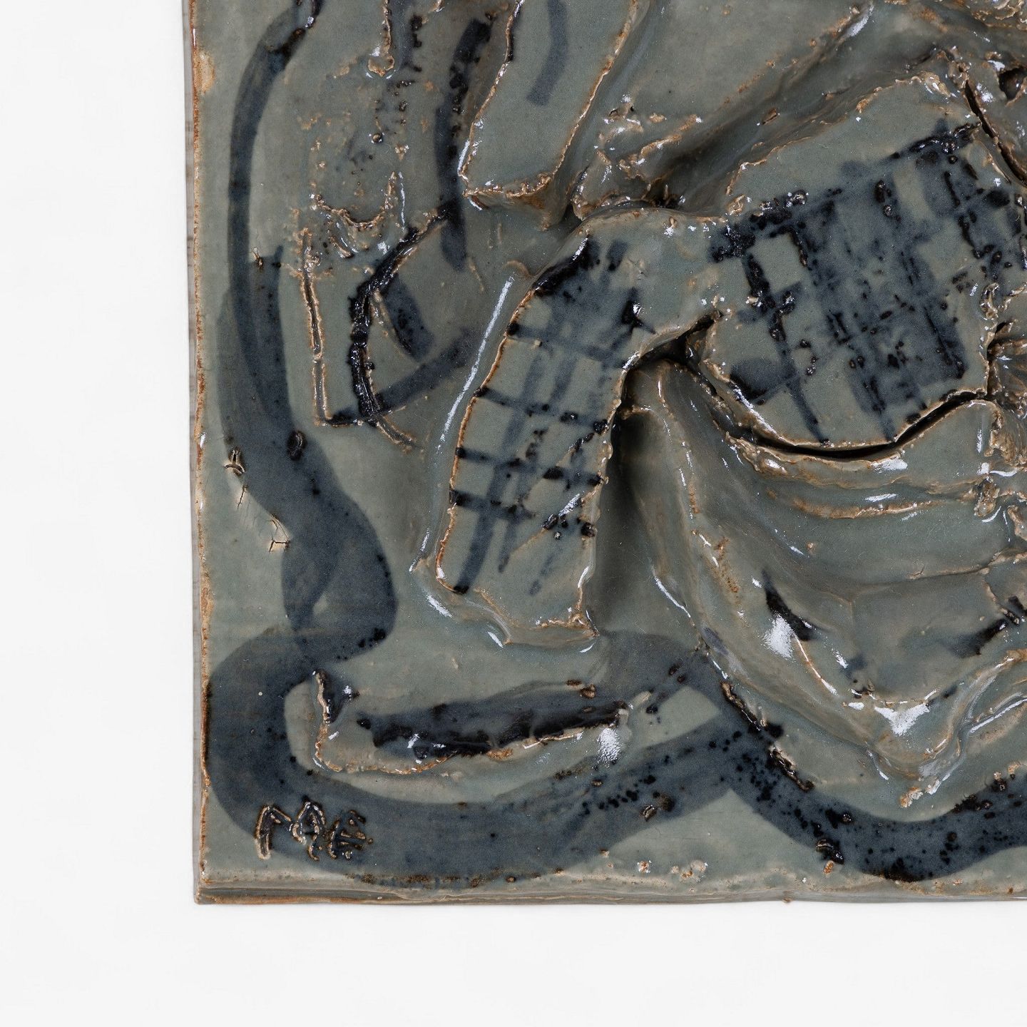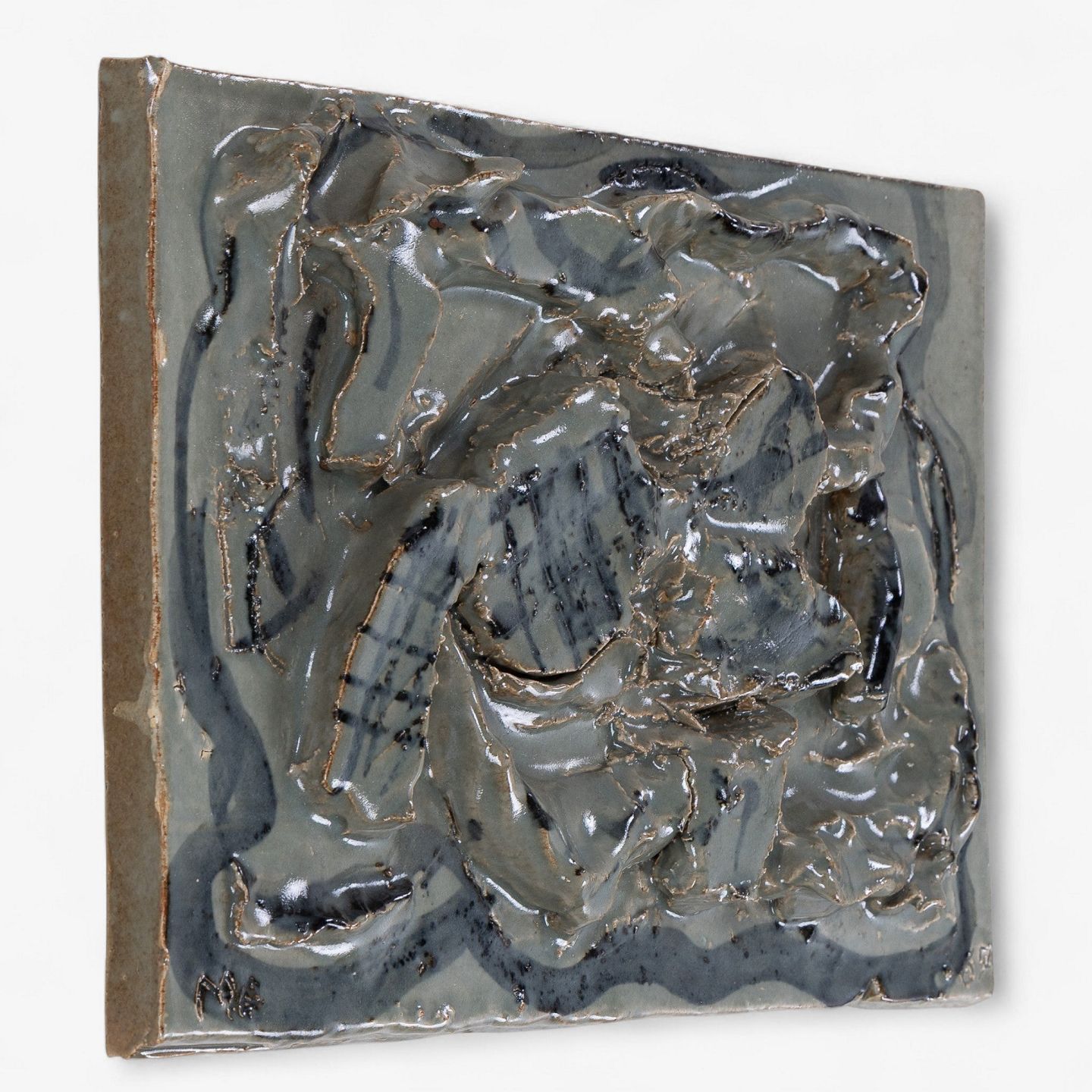 Relief i stentøj med abstrakte former og grønlig glasur. Signeret, MA 67. Stemplet fra producent.