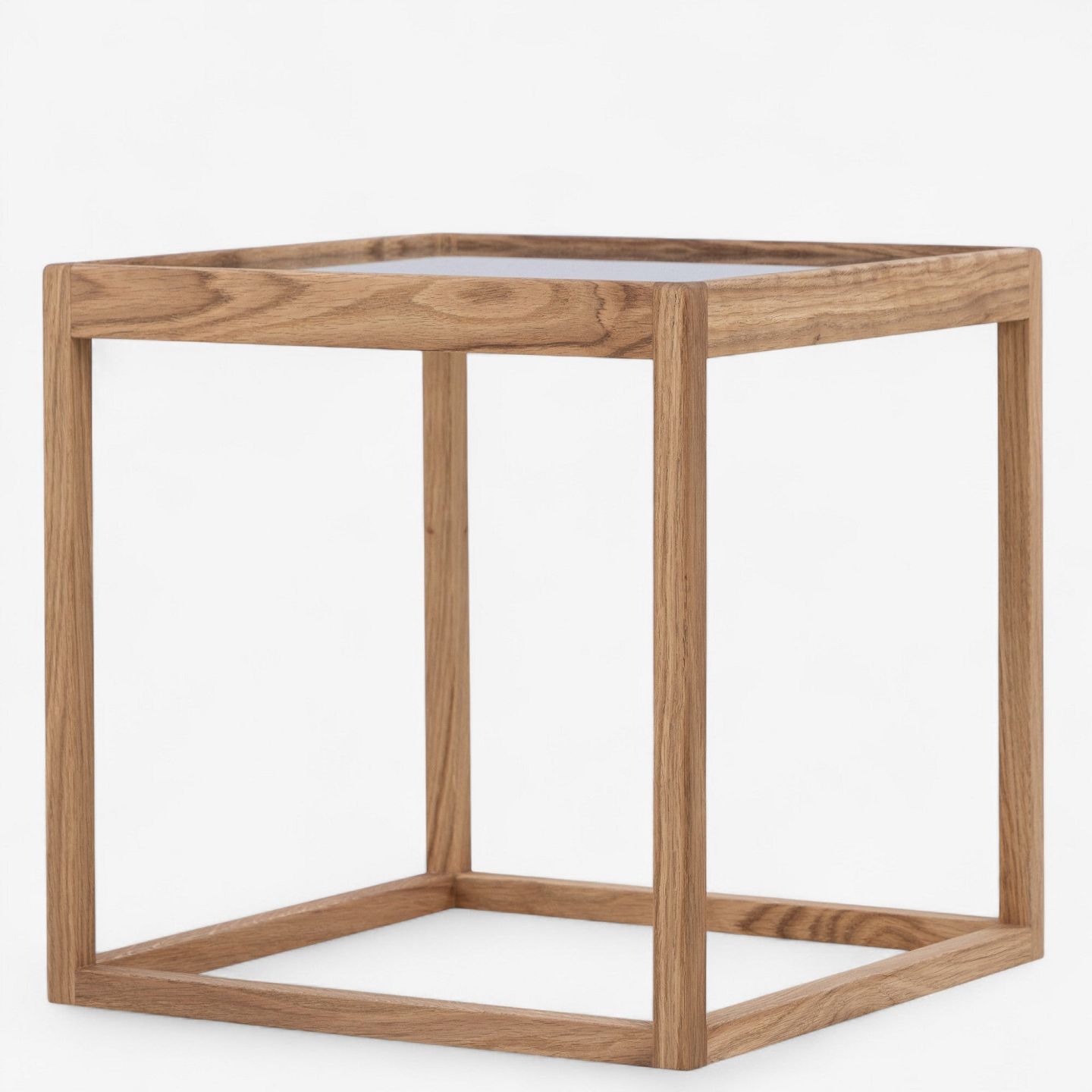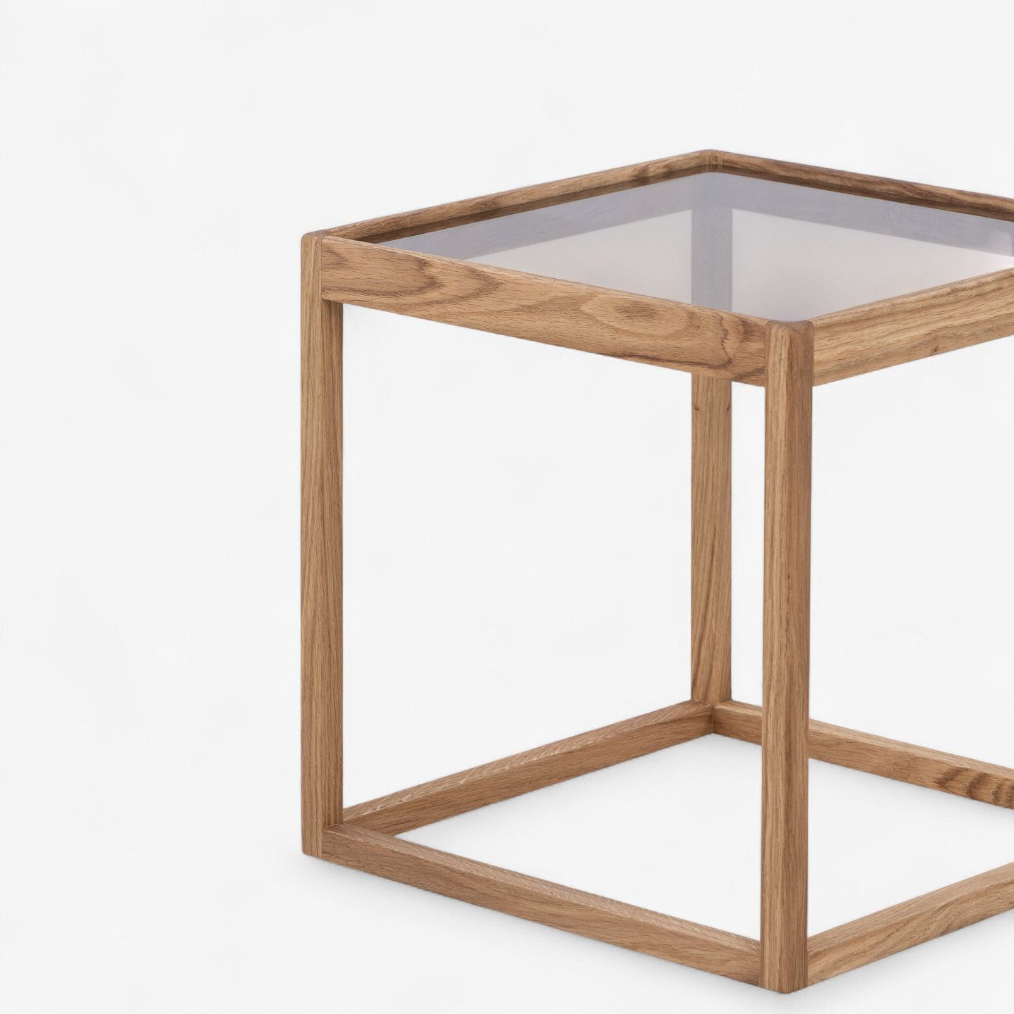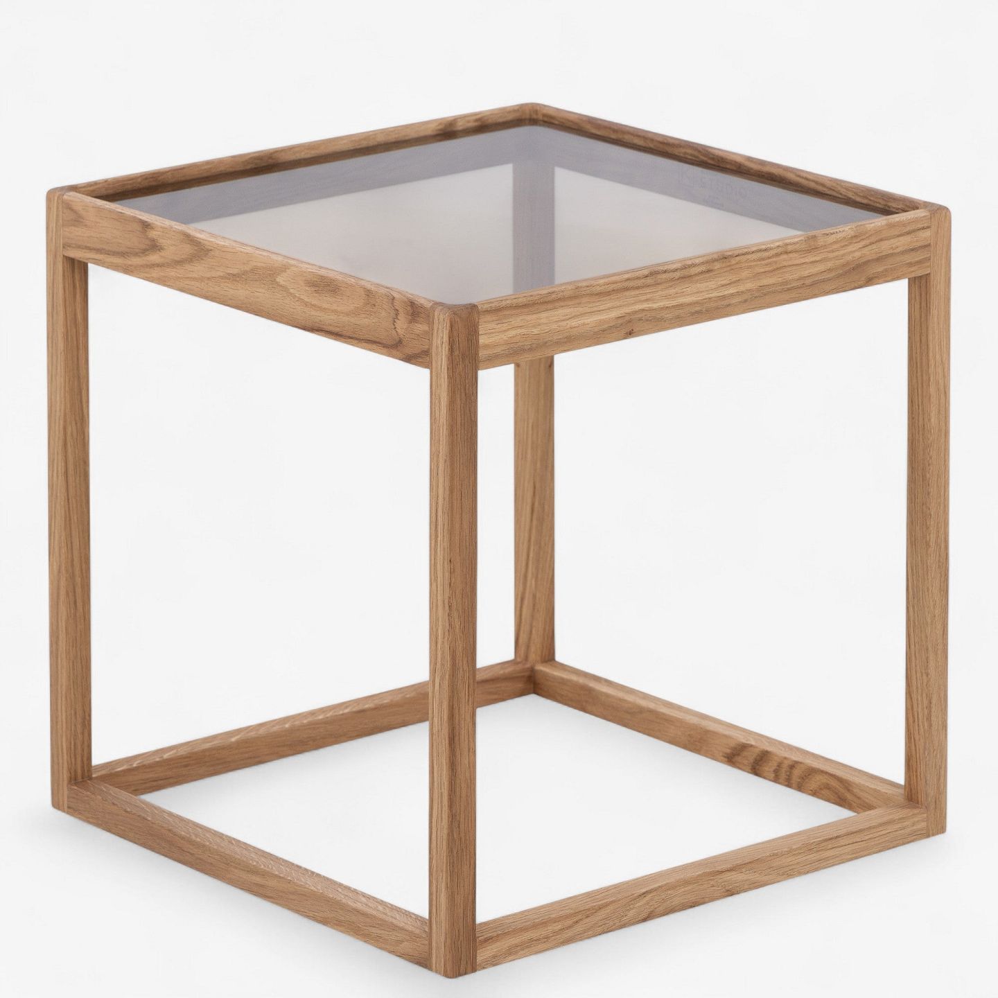 'Kubebord' med stel i olieret egetræ og røgfarvet glasplade.