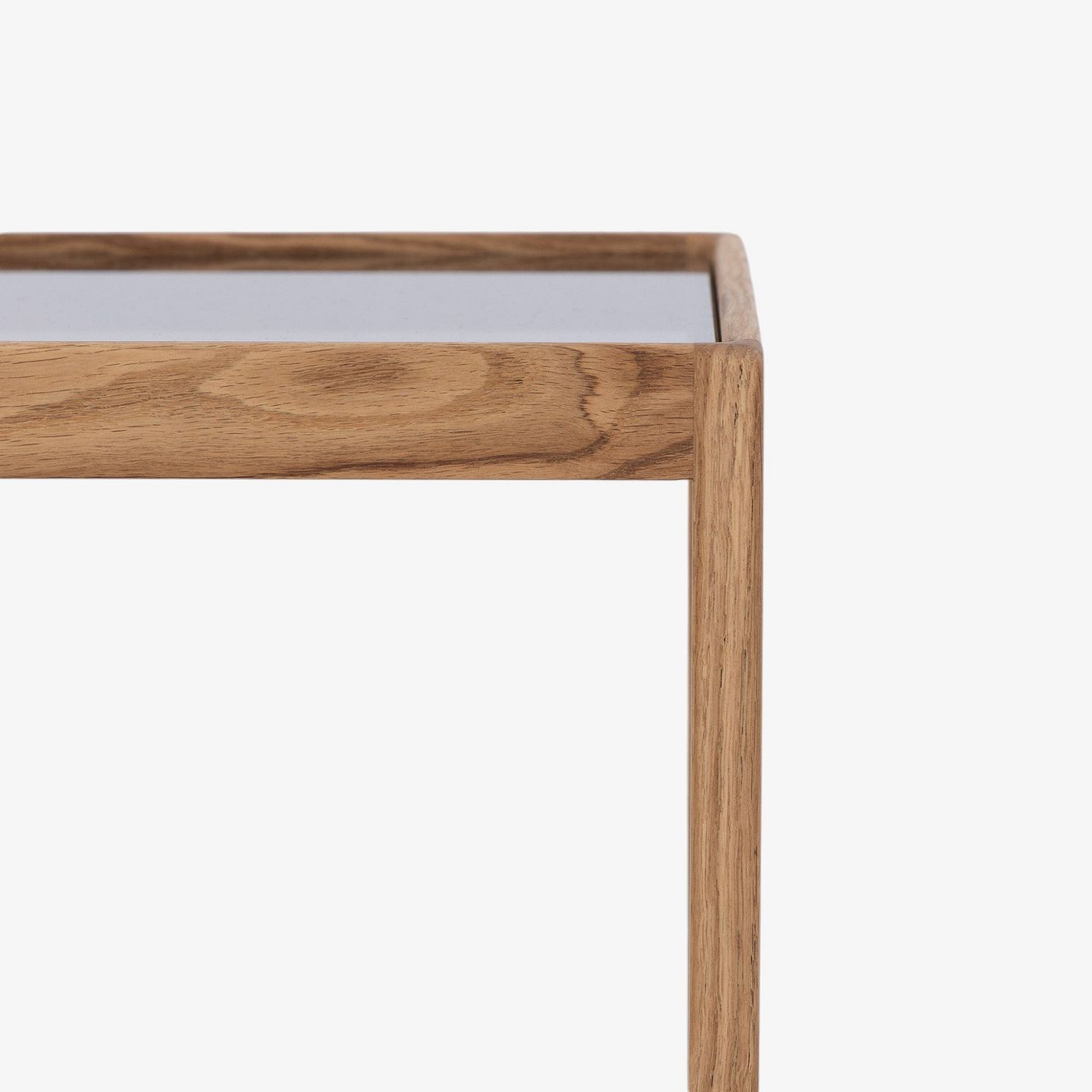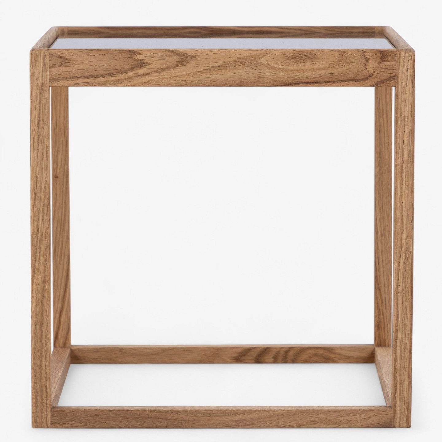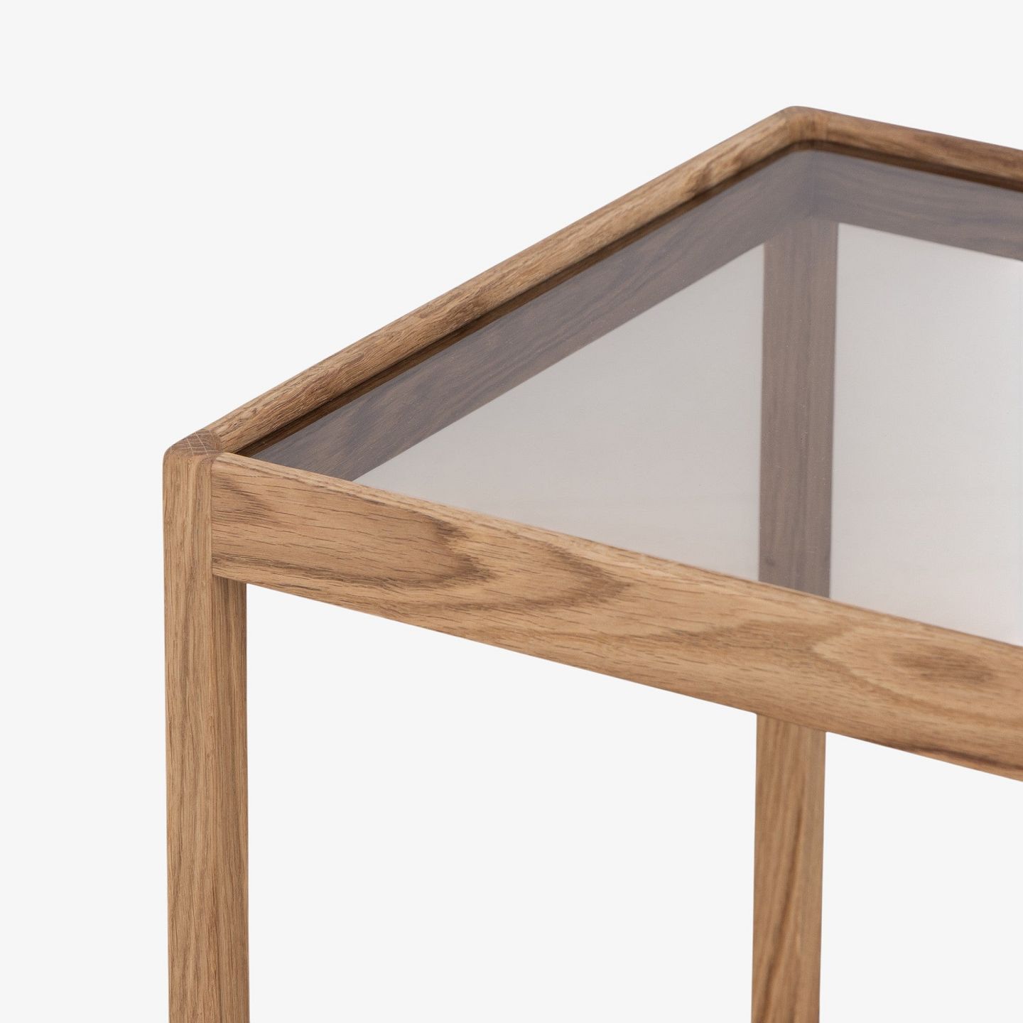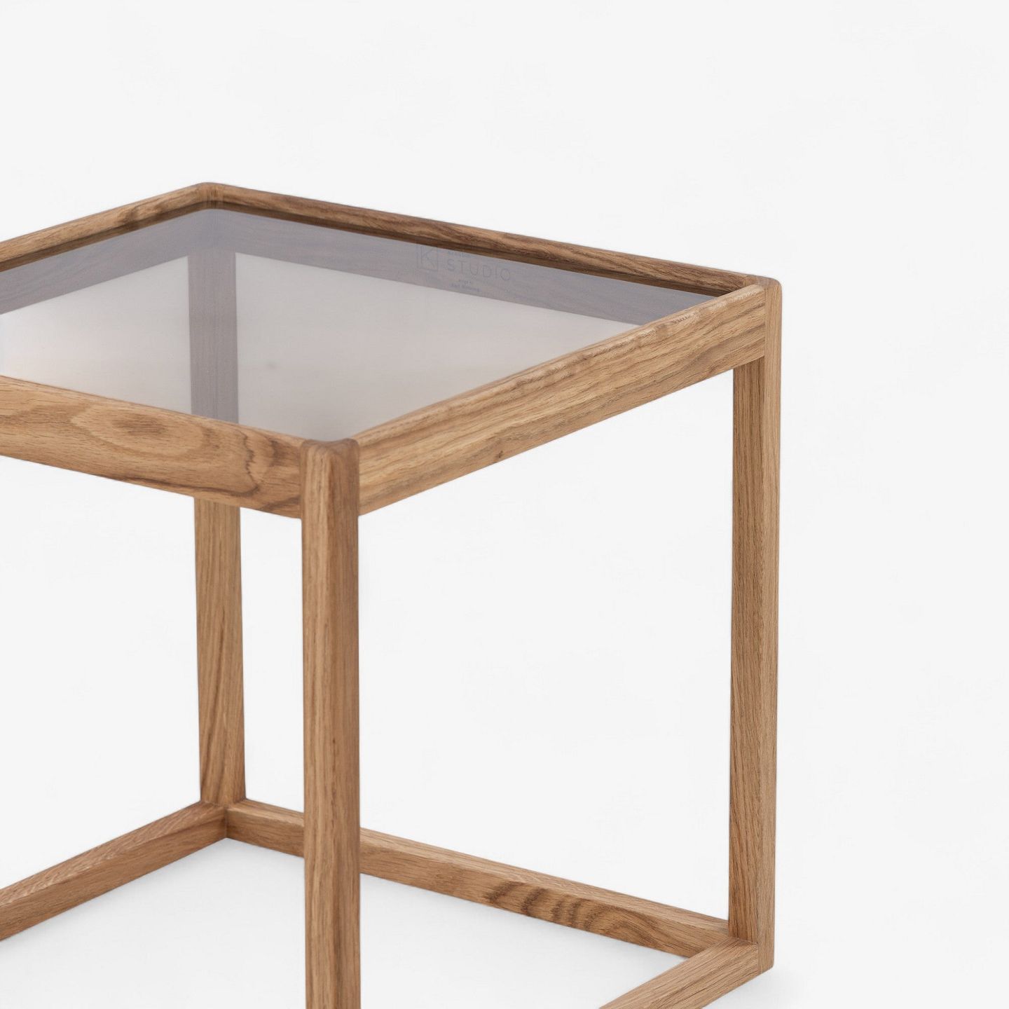 'Kubebord' med stel i olieret egetræ og røgfarvet glasplade.