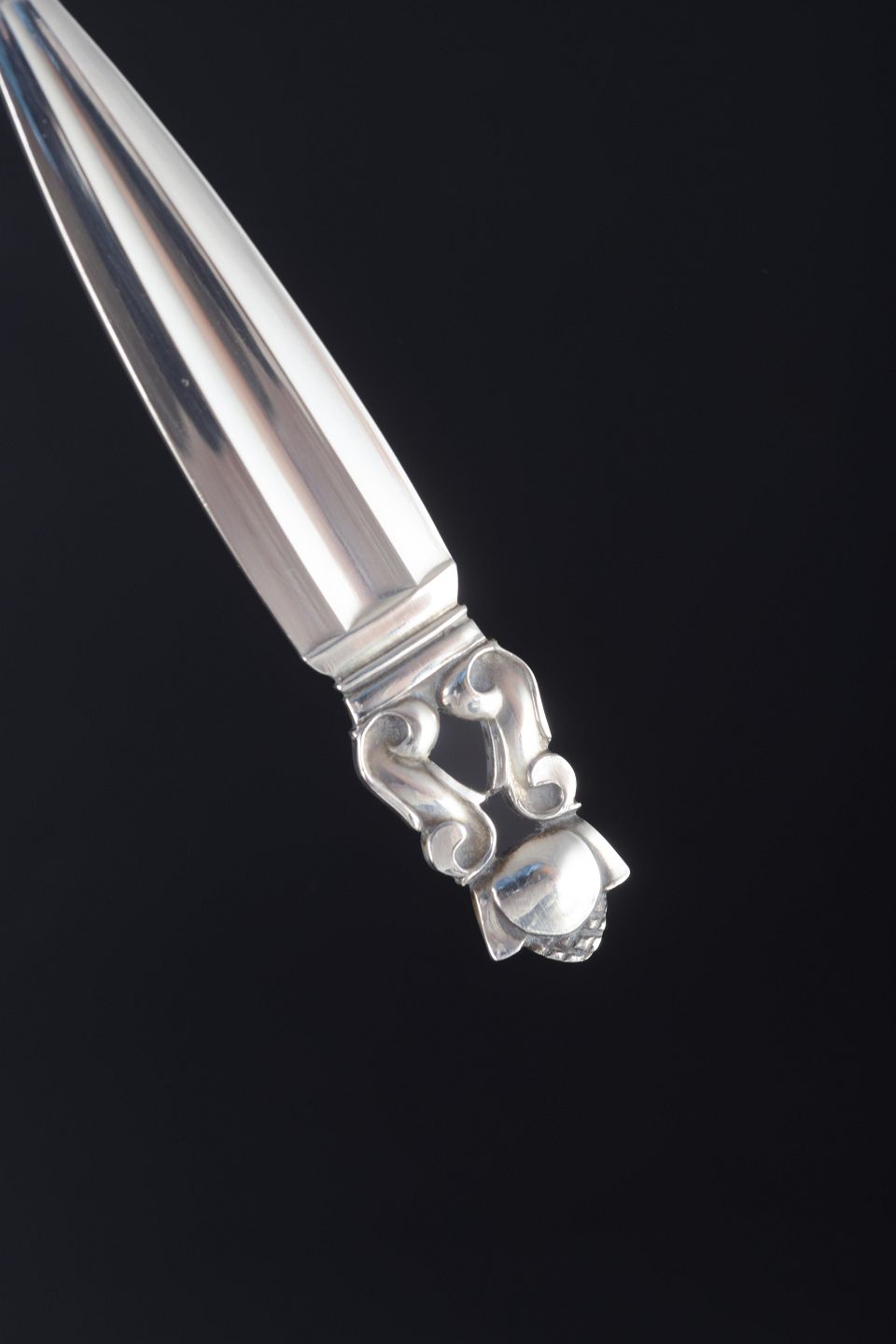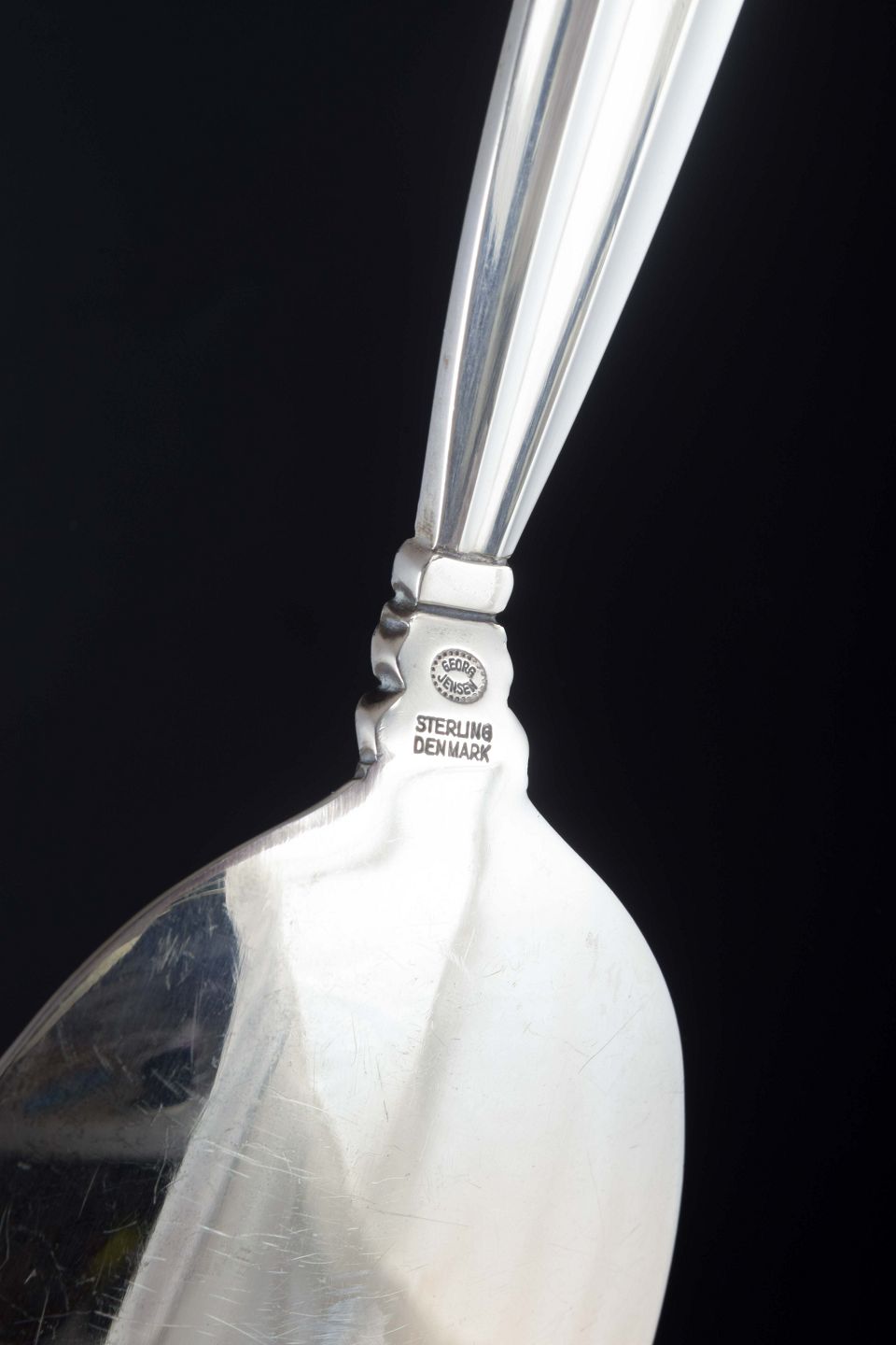 Elegant sandwichspade i det klassiske “Konge / Acorn”-mønster, designet af Johan Rohde i 1915. Skaftet er udsmykket med det karakteristiske akantusblad og agernmotiv.