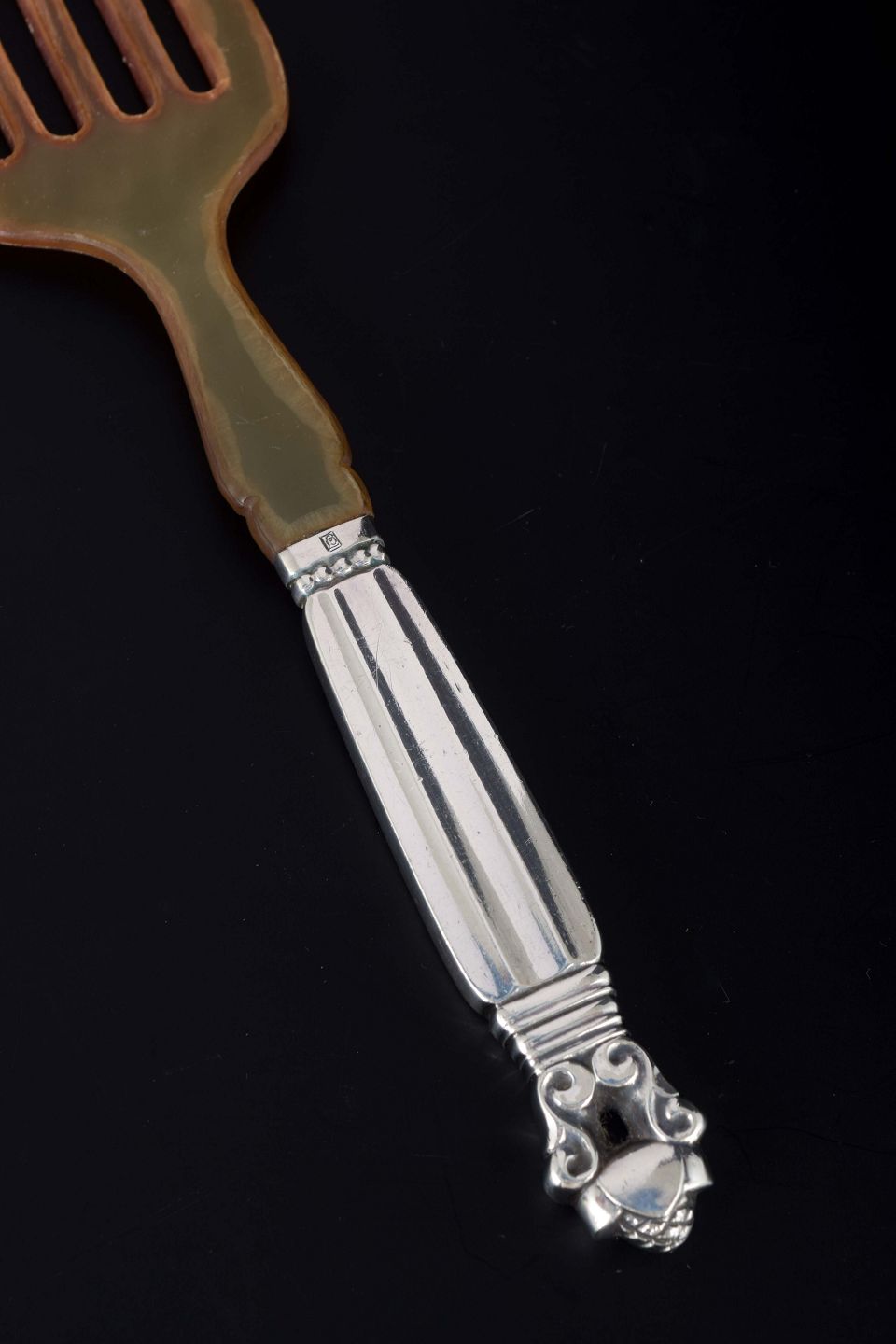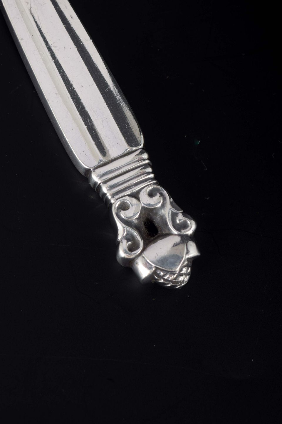 Elegant sardingaffel i det klassiske “Konge / Acorn”-mønster, designet af Johan Rohde i 1915. Skaftet er udsmykket med det karakteristiske akantusblad og agernmotiv.