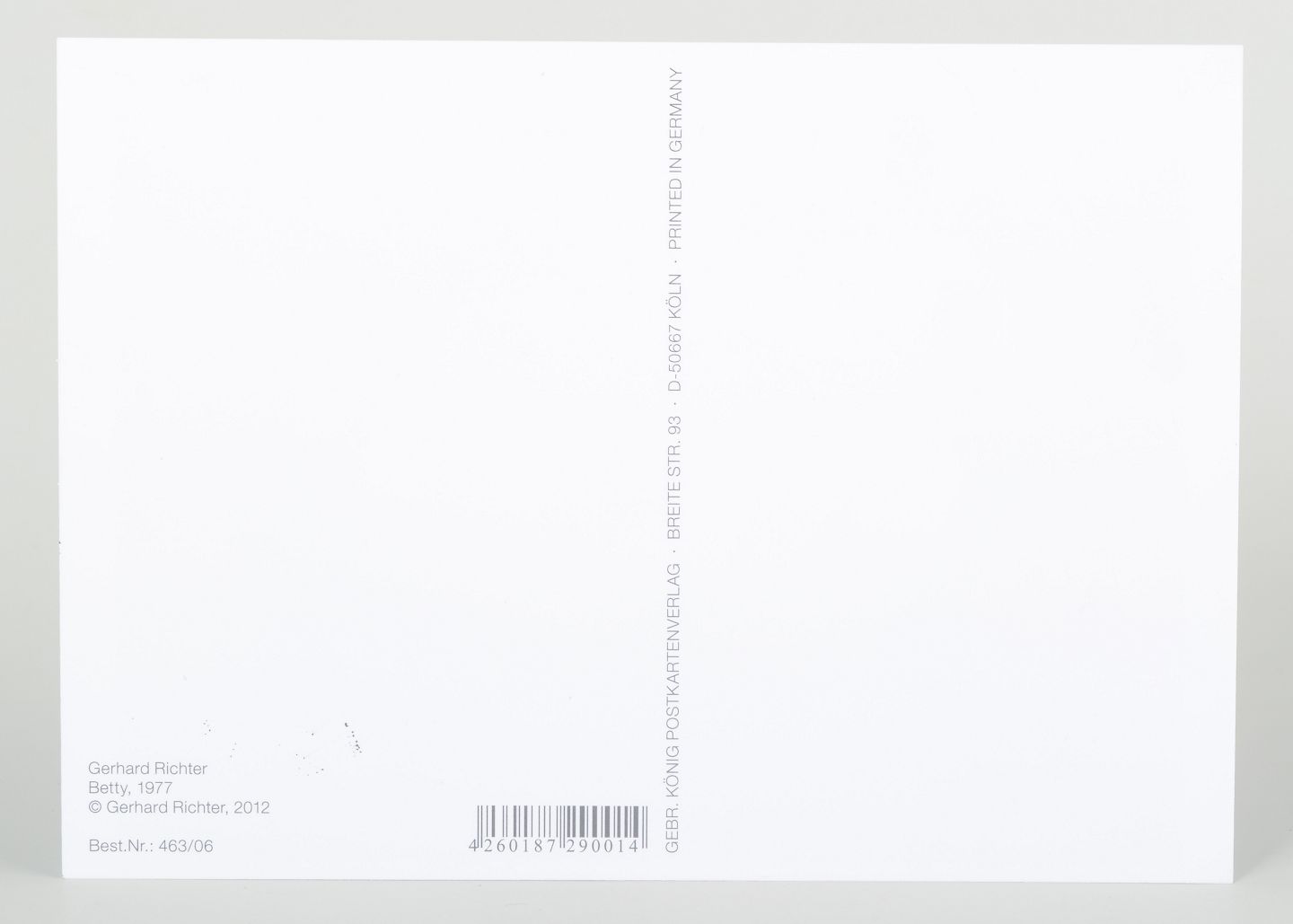 Et af Gerhard Richters mest ikoniske motiver, baseret på et fotografi af hans datter Betty, her gengivet i den berømte maleriske stil hvor realisme og intimitet mødes. Værket fremstår med en stille intensitet og viser Richters mesterværk inden for fotorealistisk portrætmaleri. Dette eksemplar er håndsigneret af kunstneren.