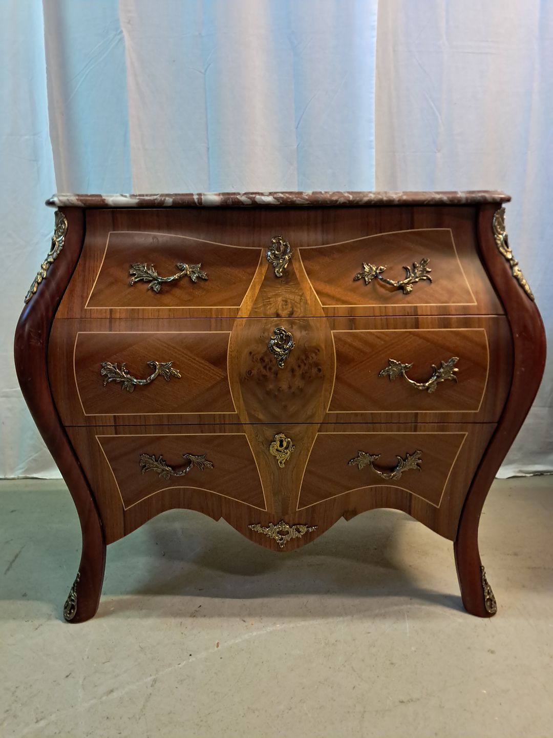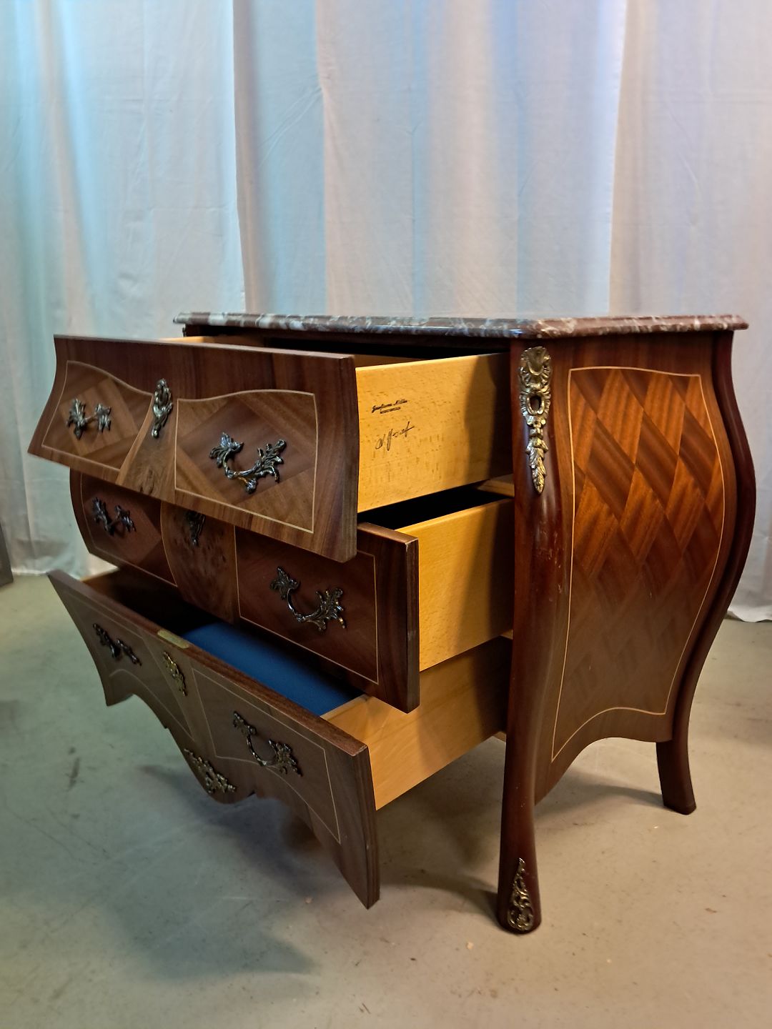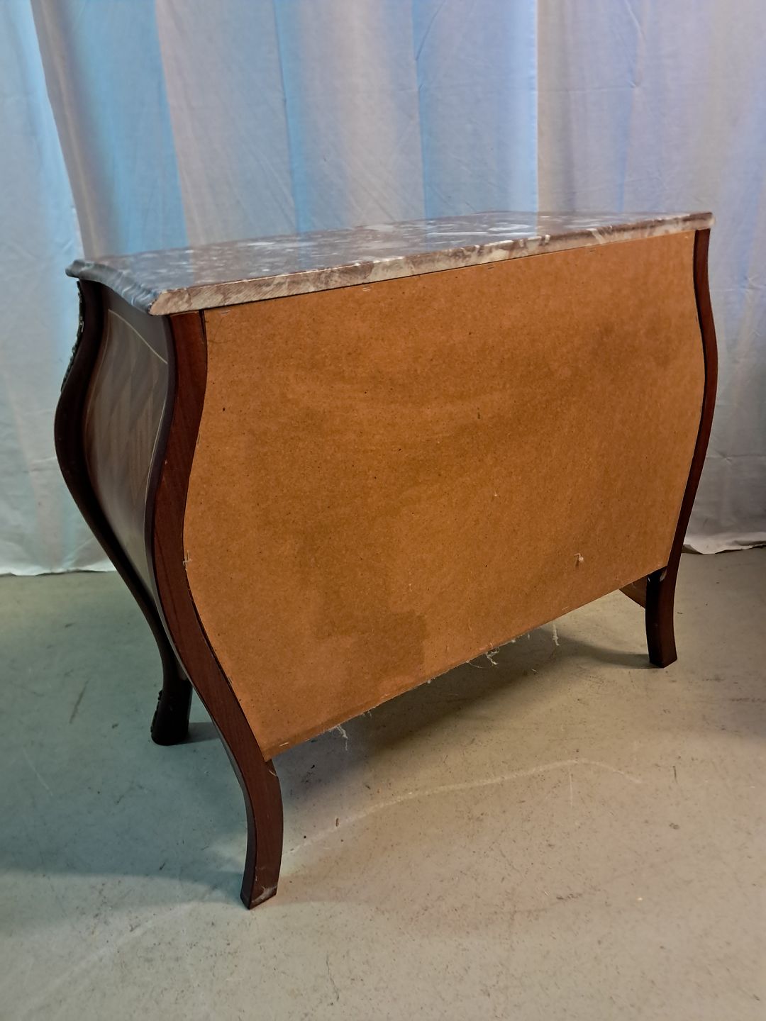 Kommode i fineret mahogni med marmorplade, fra 1980erne.