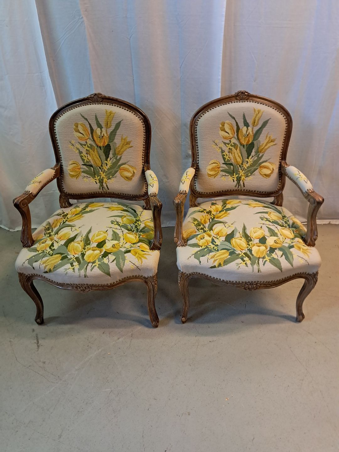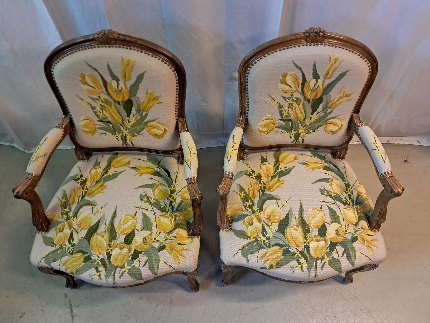 2 Armstole i massivt bøgetræ med broderet betræk, fra 1950erne.