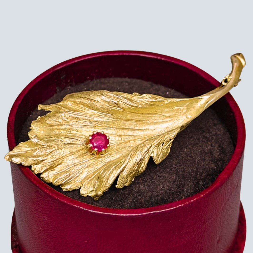 Bernhard Hertz; Broche udformet som et blad. I 14 kt. guld med rubin