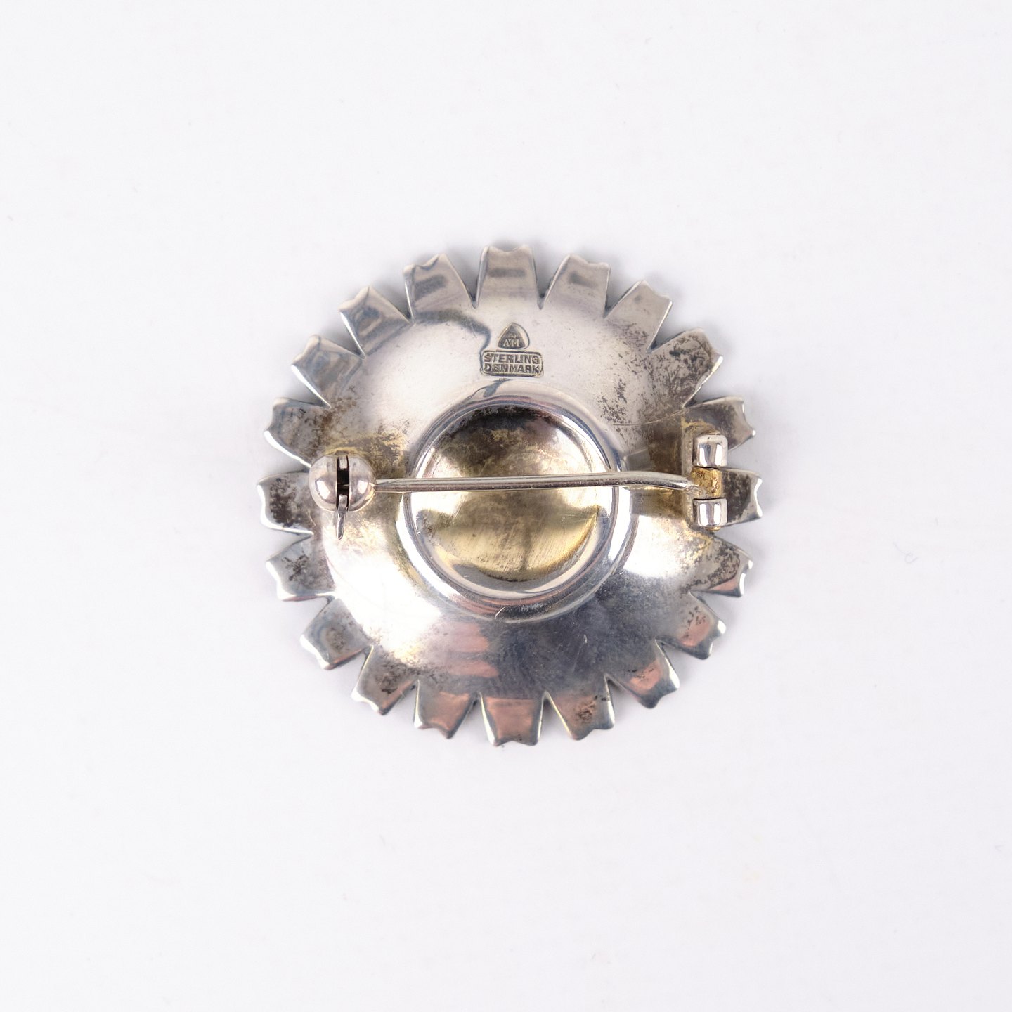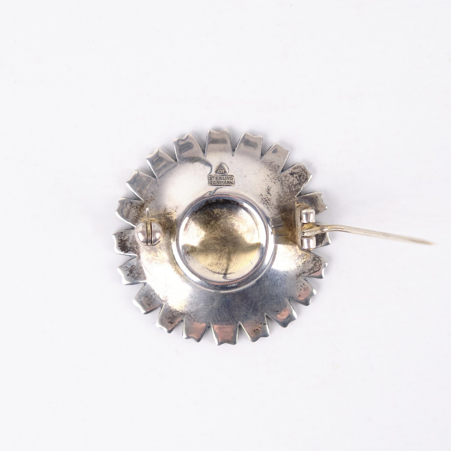 Broche fra 1940’erne udført af Anton Michelsen, stemplet AM Sterling Danmark. Forgyldt og med intakt emalje, udført i klassisk dansk smykkekunst med karakteristisk marguerit- eller blomsterinspireret formsprog. Et tidstypisk og dekorativt smykke fra en anerkendt producent.