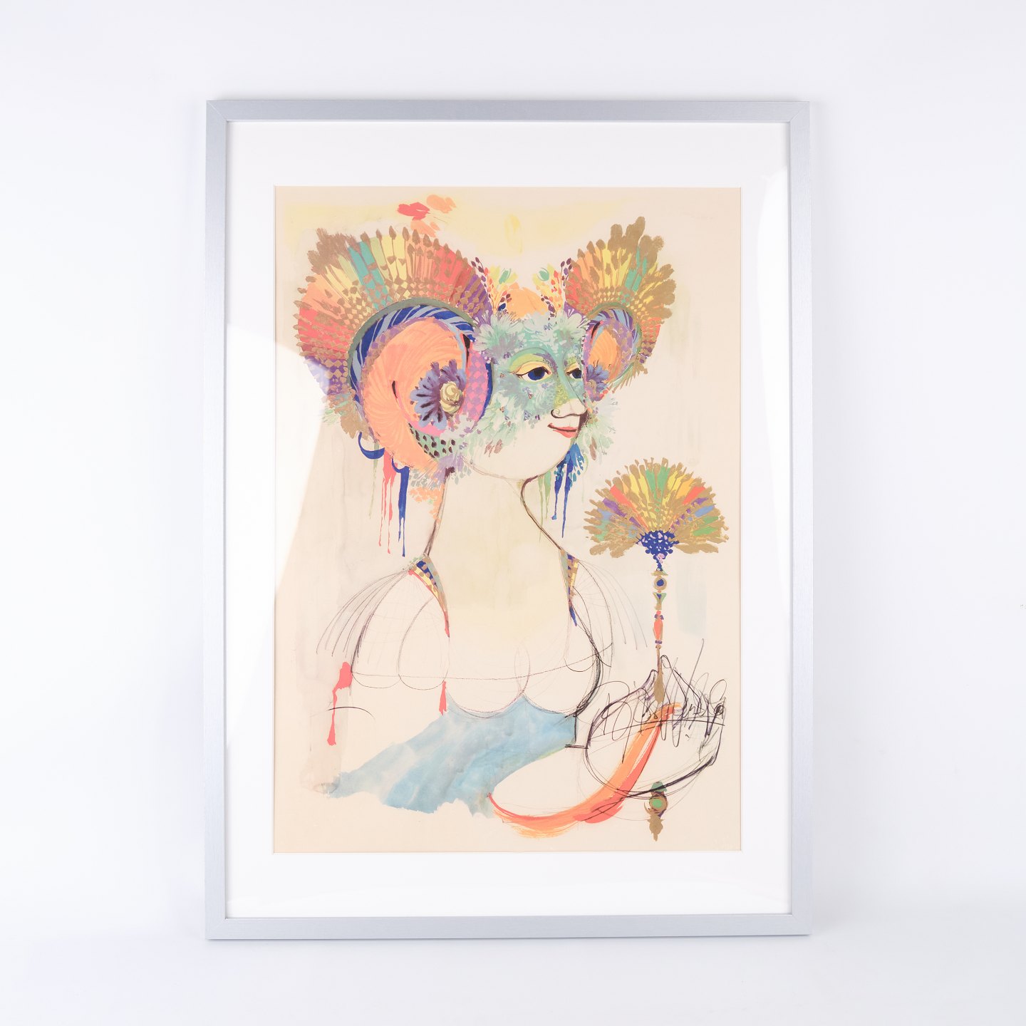 Serigrafisk plakat af Bjørn Wiinblad, signeret. Motiv af kvinde med vifte, 1970’erne. Dekorativt og klassisk Wiinblad-design.