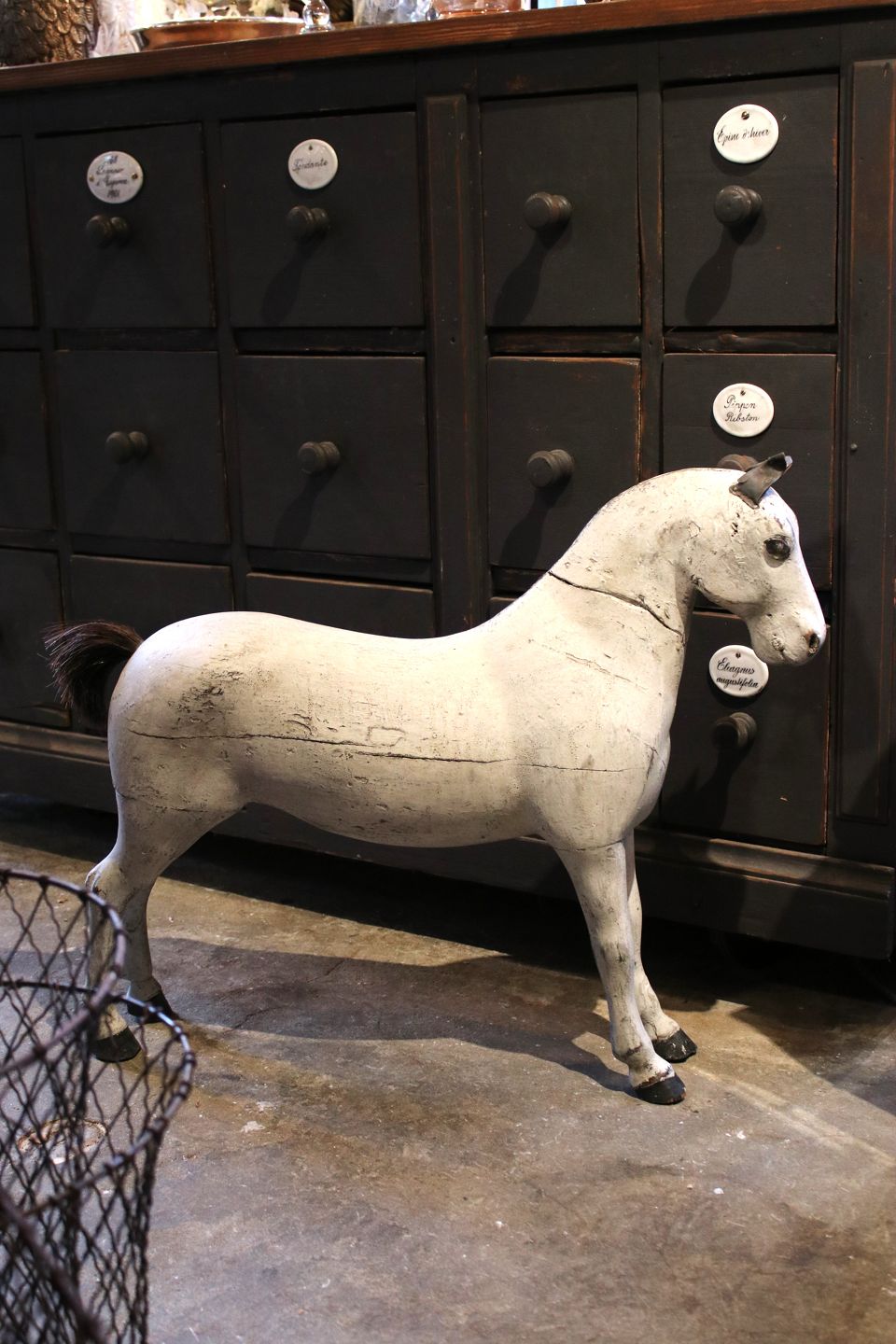 Svensk 1800 tals træ hest med fin patineret grå / hvid farve, læder øre , glas øjne og hale i ægte hestehår.