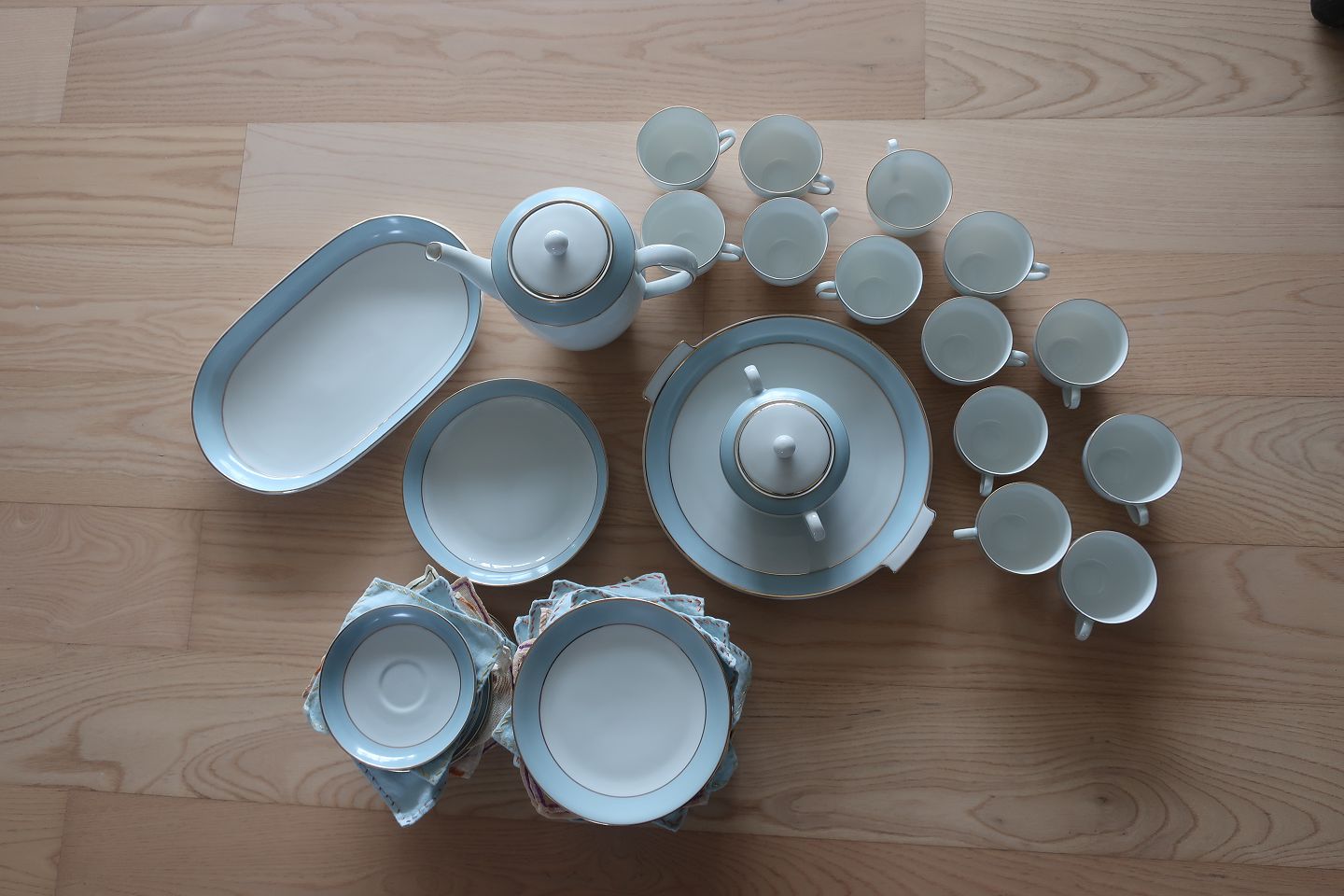 A good and light service: White with a wide light blue rim and 2 golden stribs