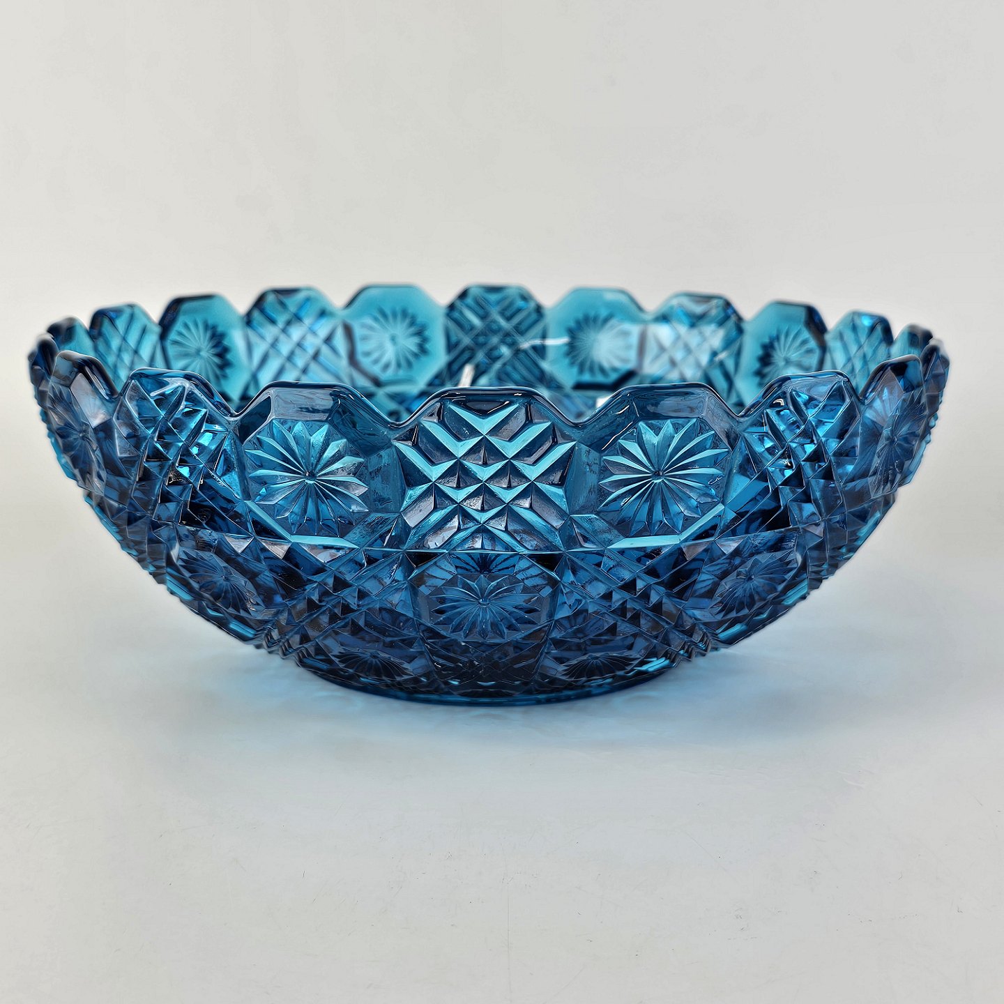 Blå diamantskål i presset glas med efterligning af skærslibning