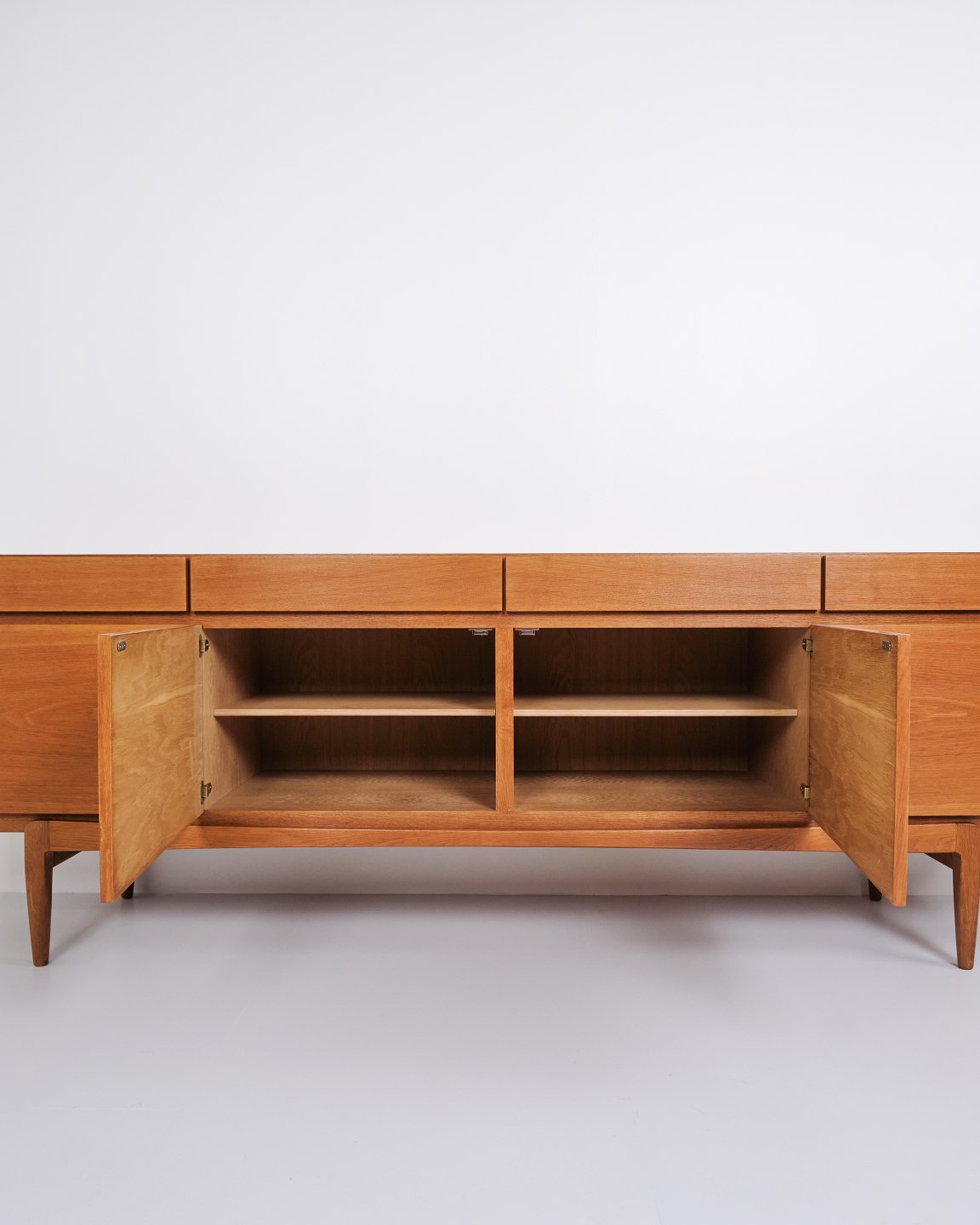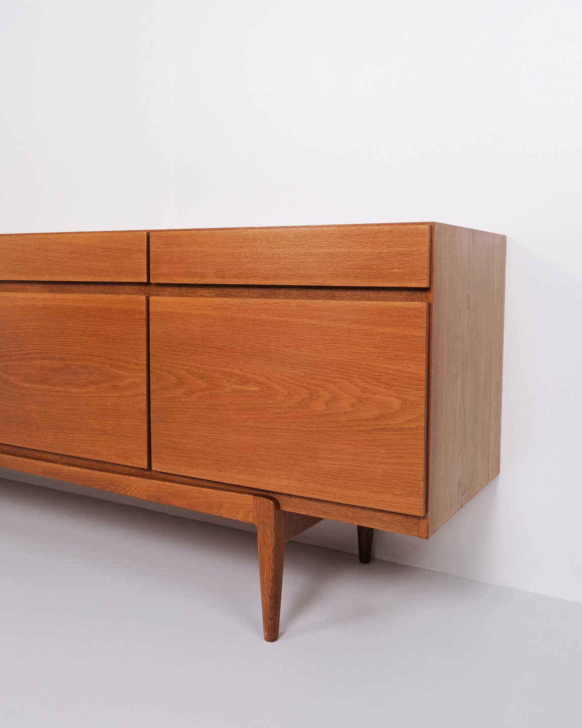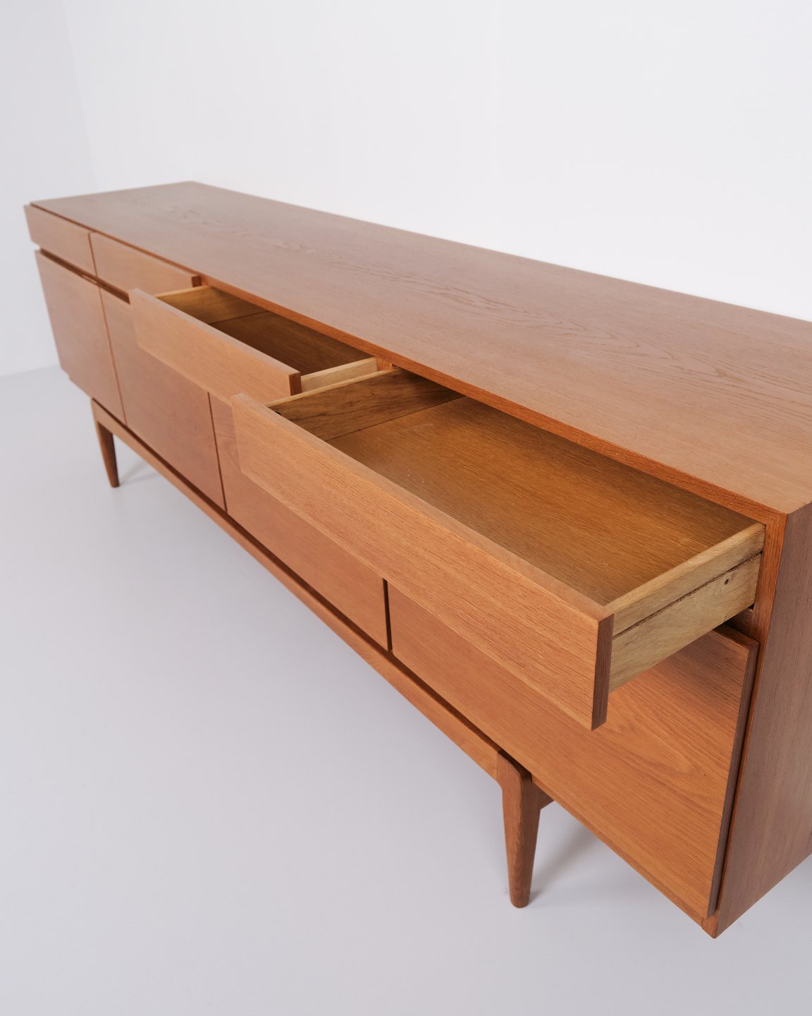 Stor skænk i egetræ, model FA66, designet af Ib Kofod-Larsen og produceret af Faarup Møbelfabrik i 1960’erne. Skænken er udformet med fire skydelåger og indvendige hylder samt skuffer, som giver rigelig opbevaringsplads.