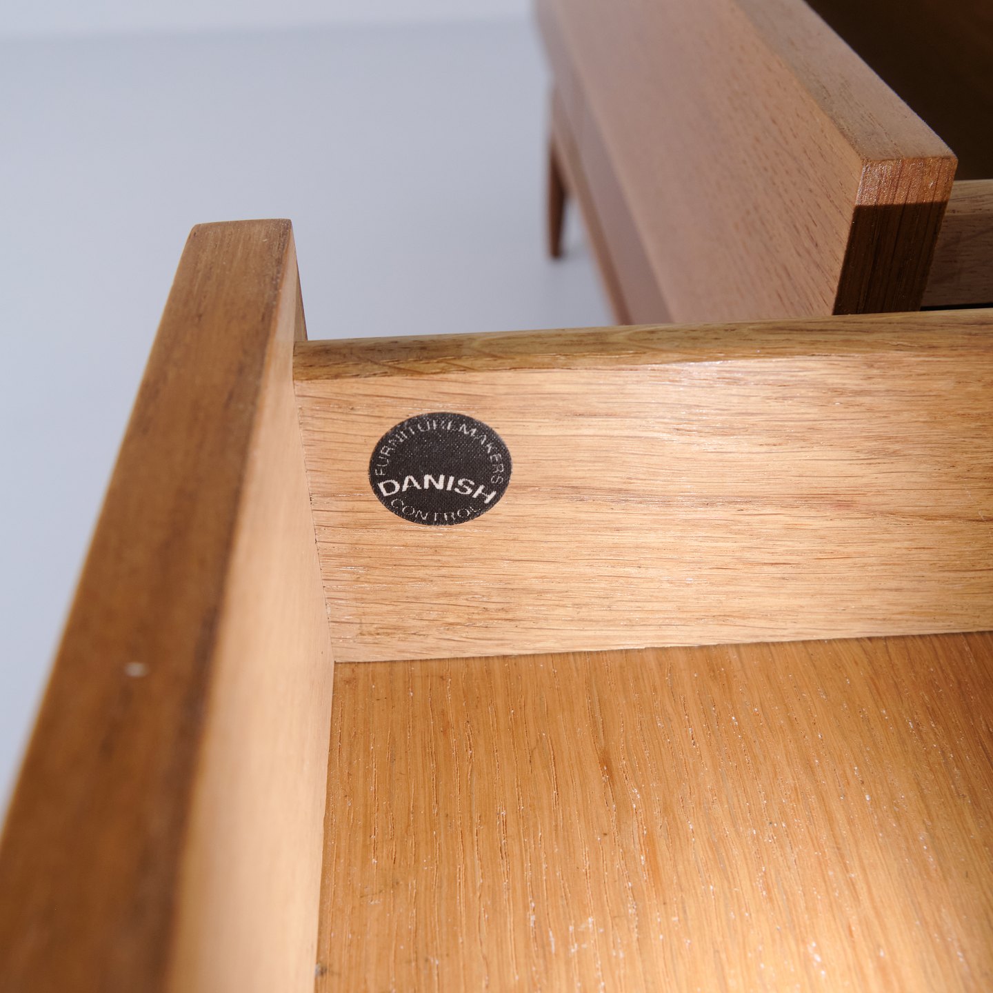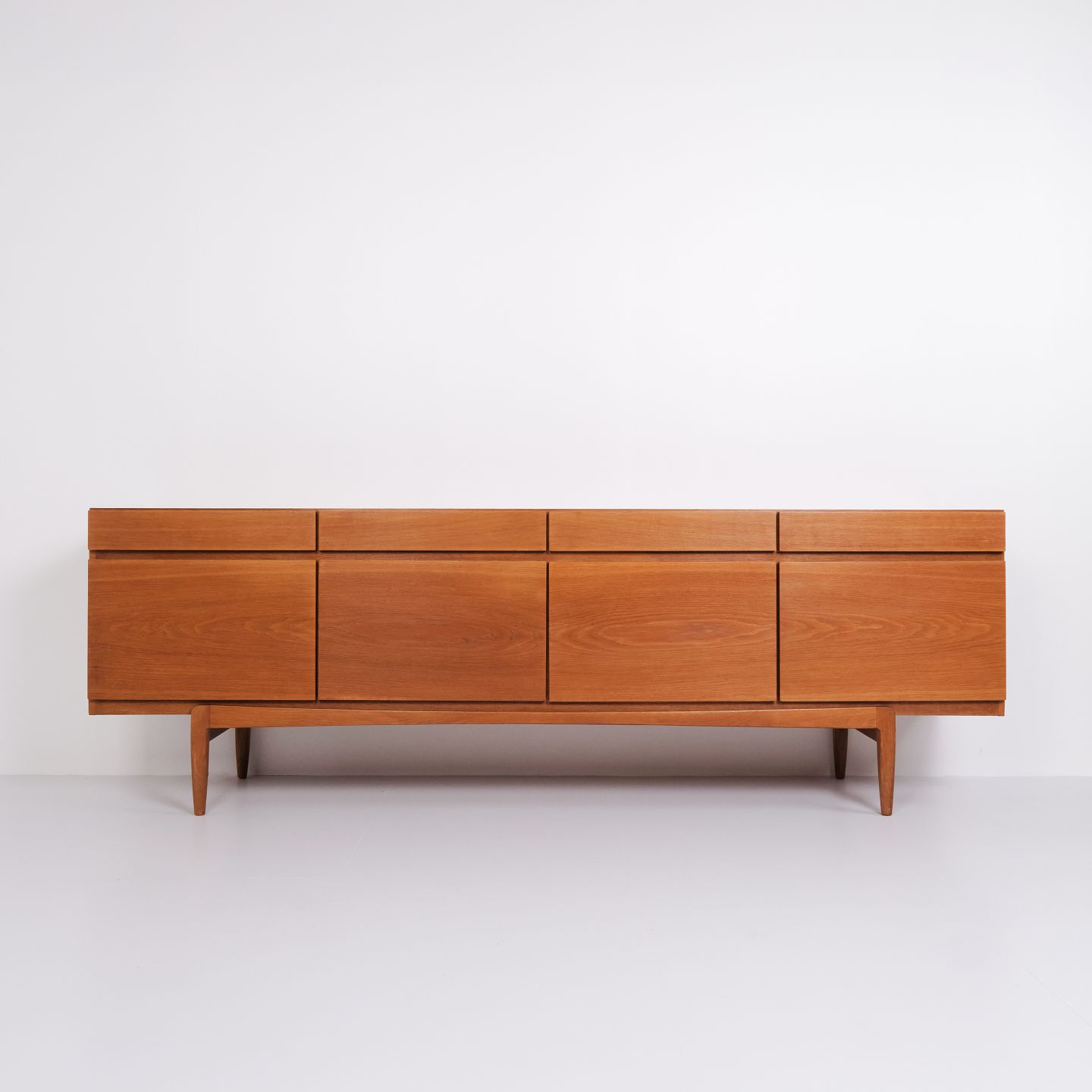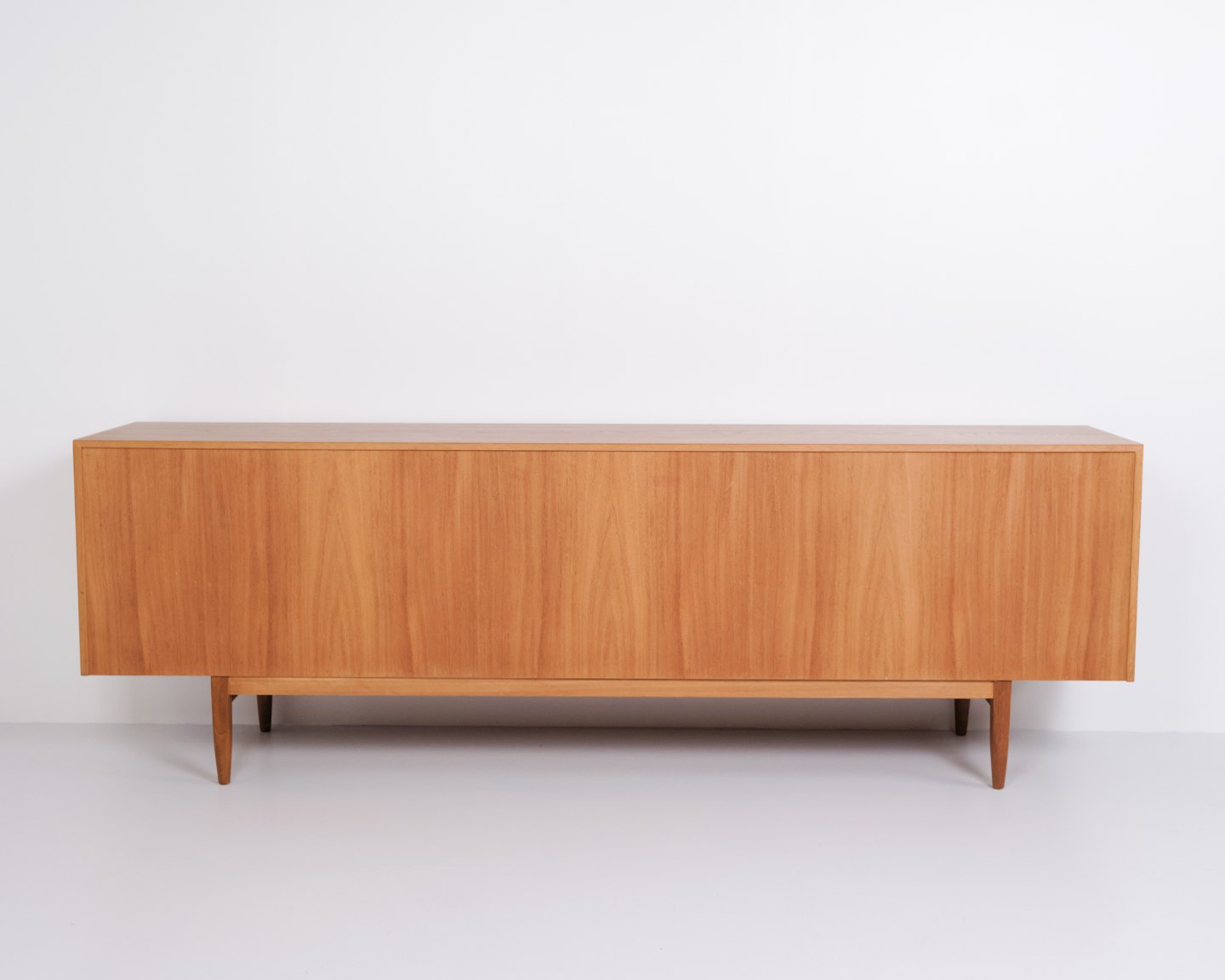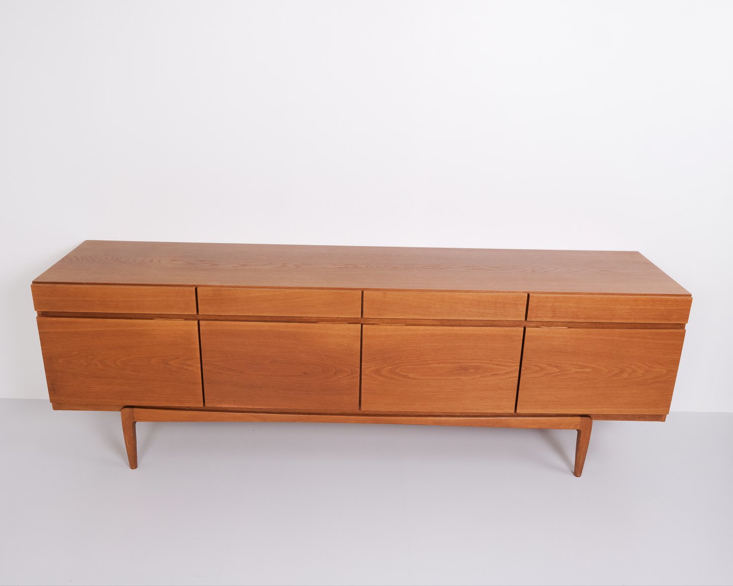 Stor skænk i egetræ, model FA66, designet af Ib Kofod-Larsen og produceret af Faarup Møbelfabrik i 1960’erne. Skænken er udformet med fire skydelåger og indvendige hylder samt skuffer, som giver rigelig opbevaringsplads.