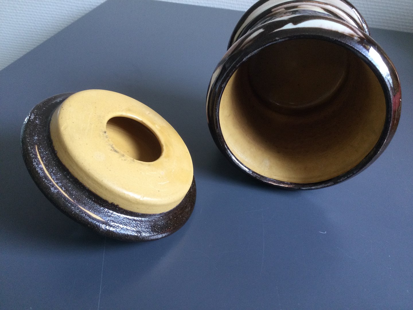 Dekoreret i blåt og brunt med kohornsteknikken.