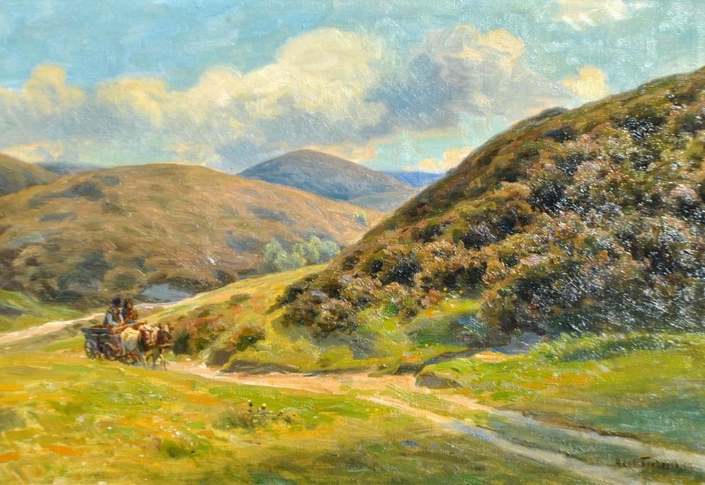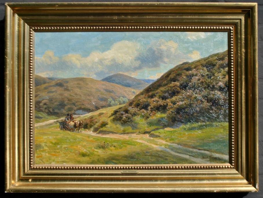 Frederiksen, Axel (1881 - 1961) Danmark: En studetrukket vogn i Rebild Bakker. Olie på lærred. Signeret. 50 x 70 cm.