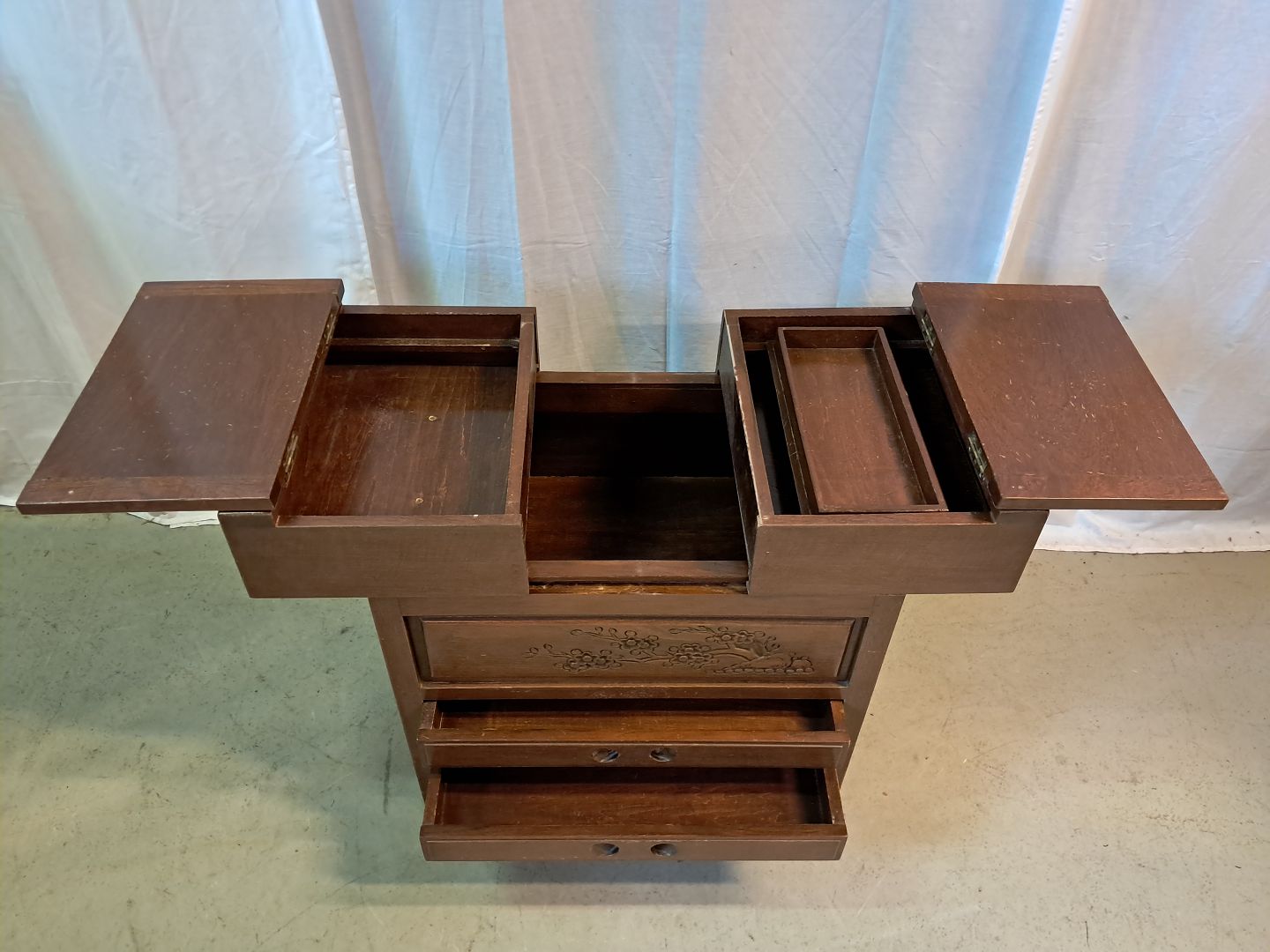 Asiatisk opbevaringsmøbel i fineret mahogni, fra 1980erne.