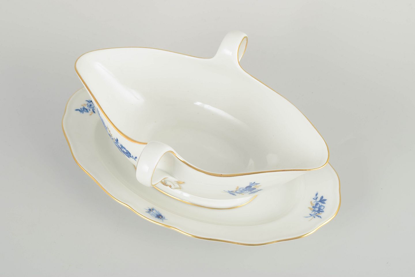 Hånddekoreret porcelæn med håndmalede blå blomsterdekorationer og forgyldte stafferinger langs kanter og hank. Elegant asymmetrisk form med dobbelt hank.