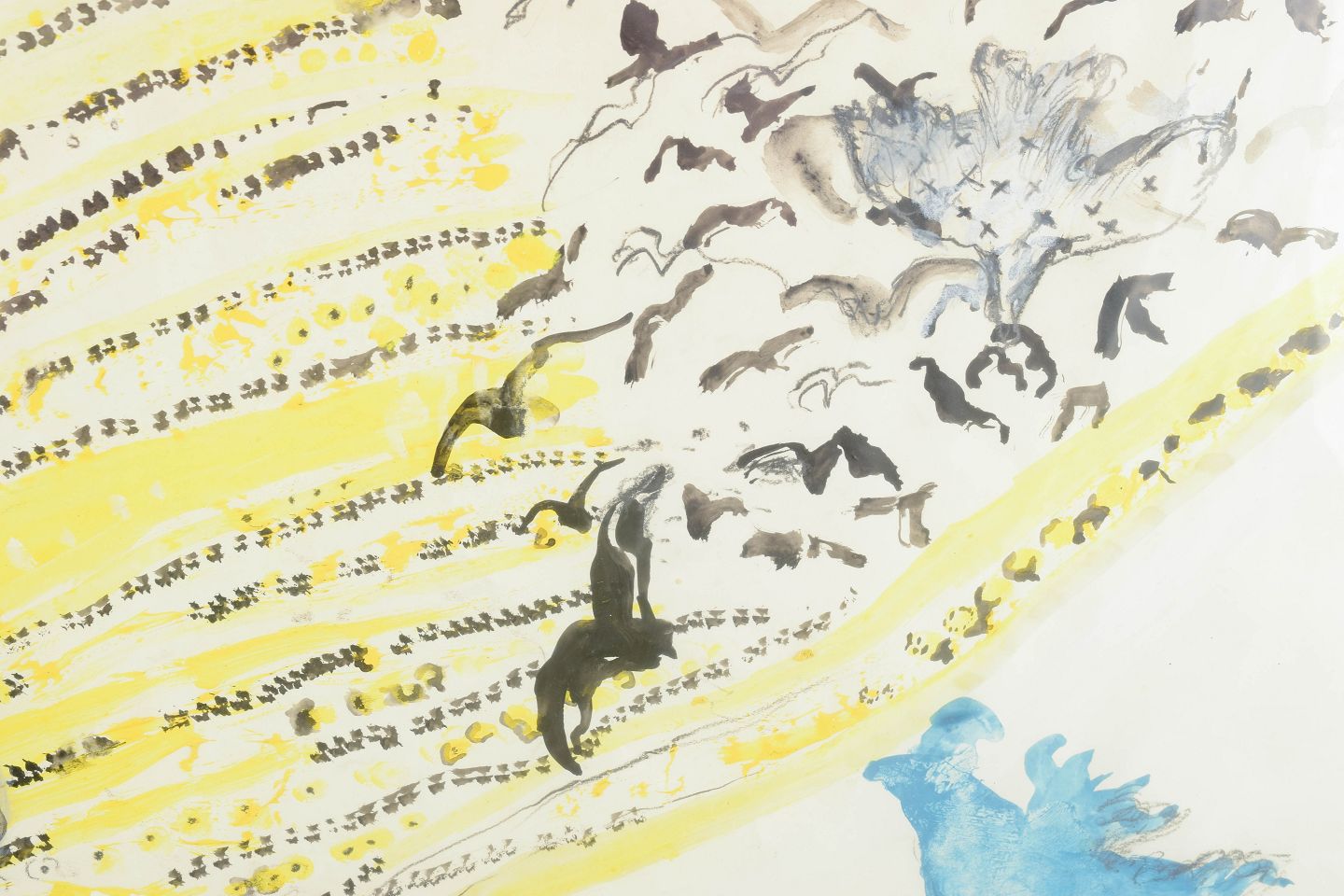 Et poetisk og bevægelsesfyldt akvarelmaleri, hvor musikalske gule rytmer bølger diagonalt gennem billedet og opløses i en sværm af flyvende fuglesilhuetter. Til venstre anes dybere, organiske formationer i blågrå toner, mens en lysere blå figurform svæver frit mod højre. Et værk med drømmende lethed og spirituel energi.