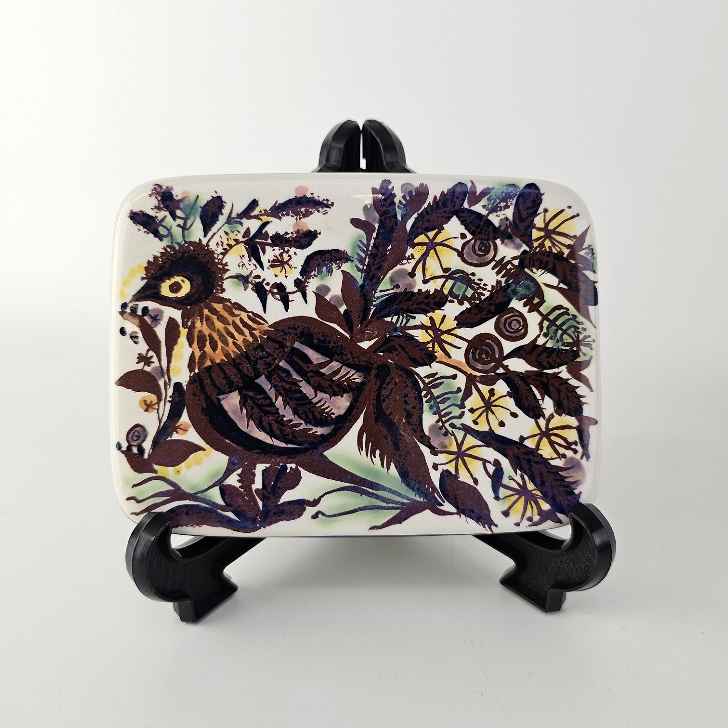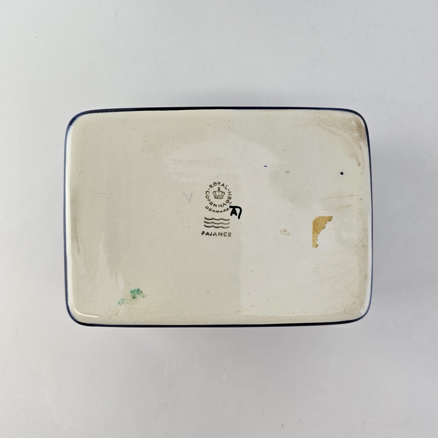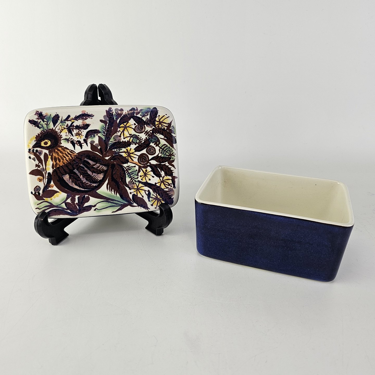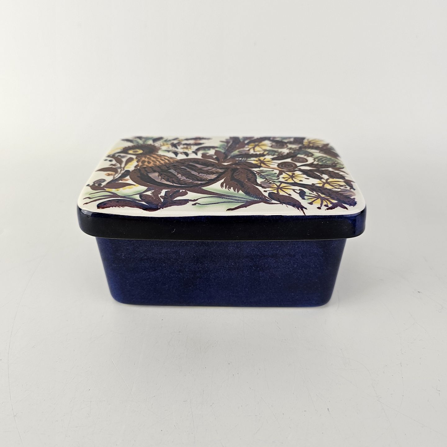 Smørboks fra serien Tenera. Boksen er i hvid fajance med blåmalet yderside og låget er dekoreret med motiv af en påfugl