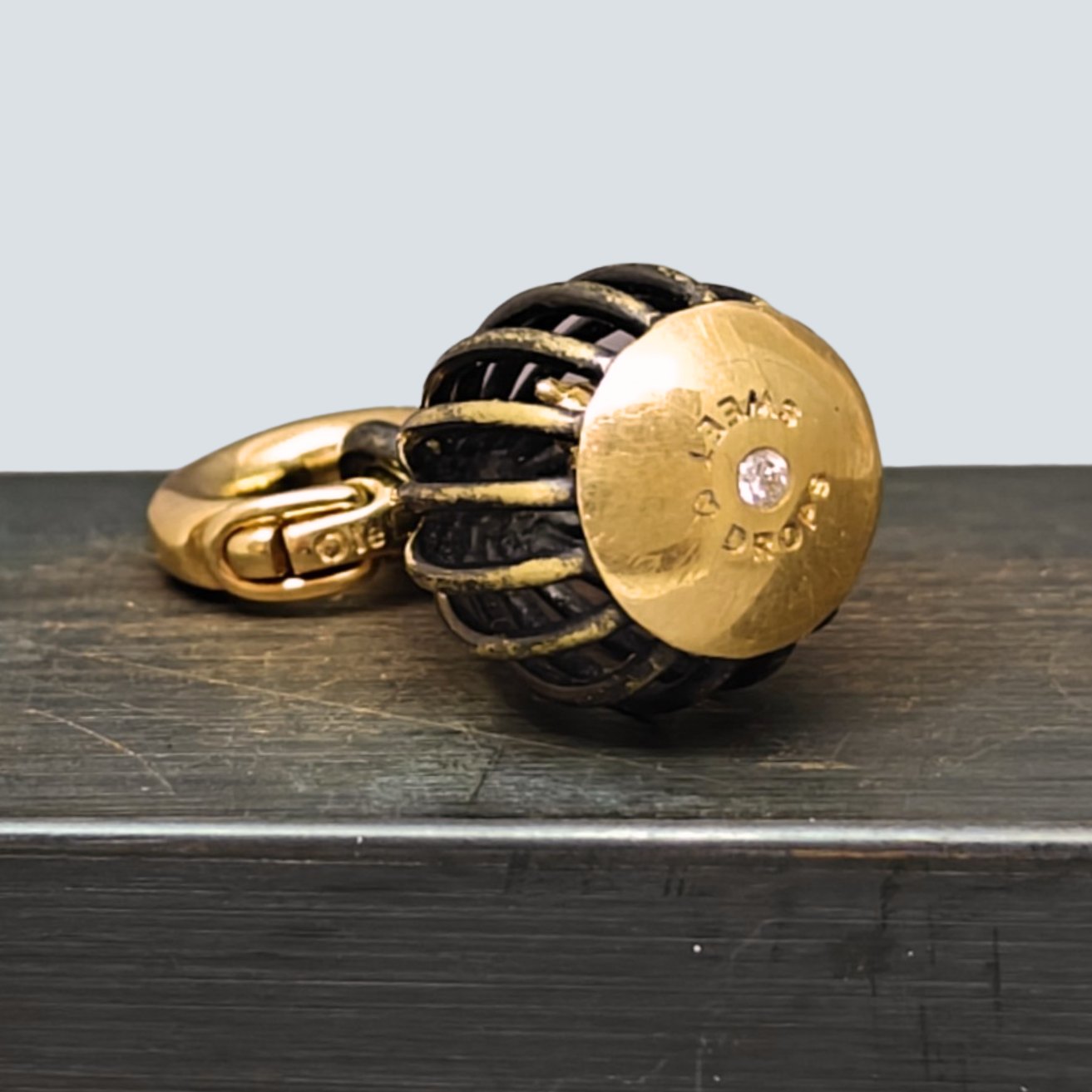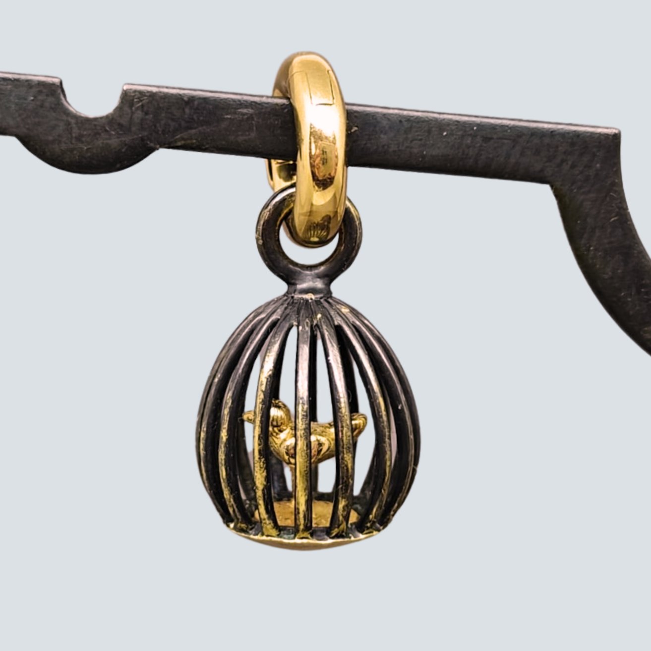Ole Lynggaard; Sweet drop charm to put on bracelets or necklaces. in 18k gold, with small diamond. Oxidized gold birdcage with gold bird. Can be opened, so it can also be put on a pearl or stone chain.