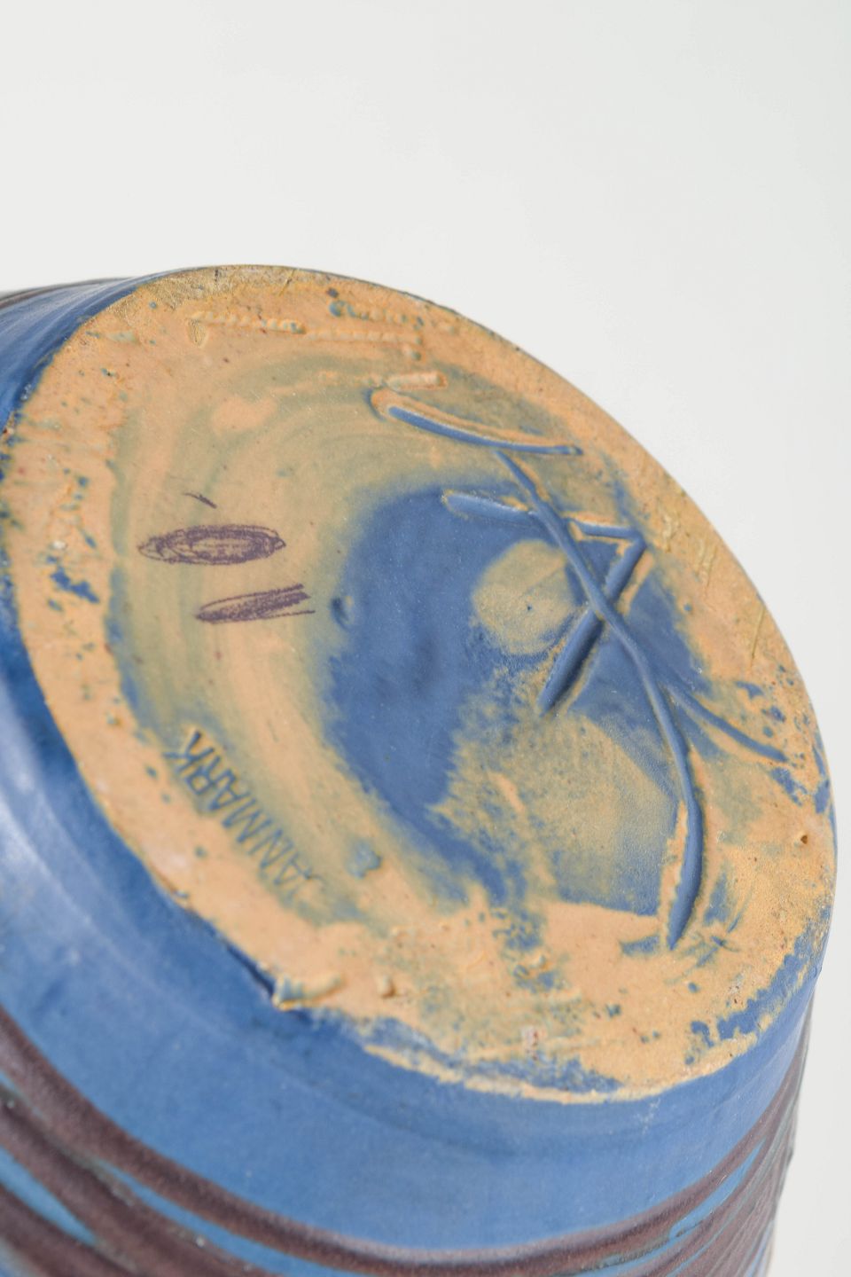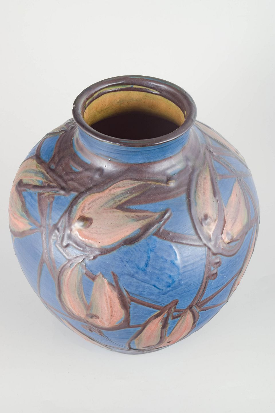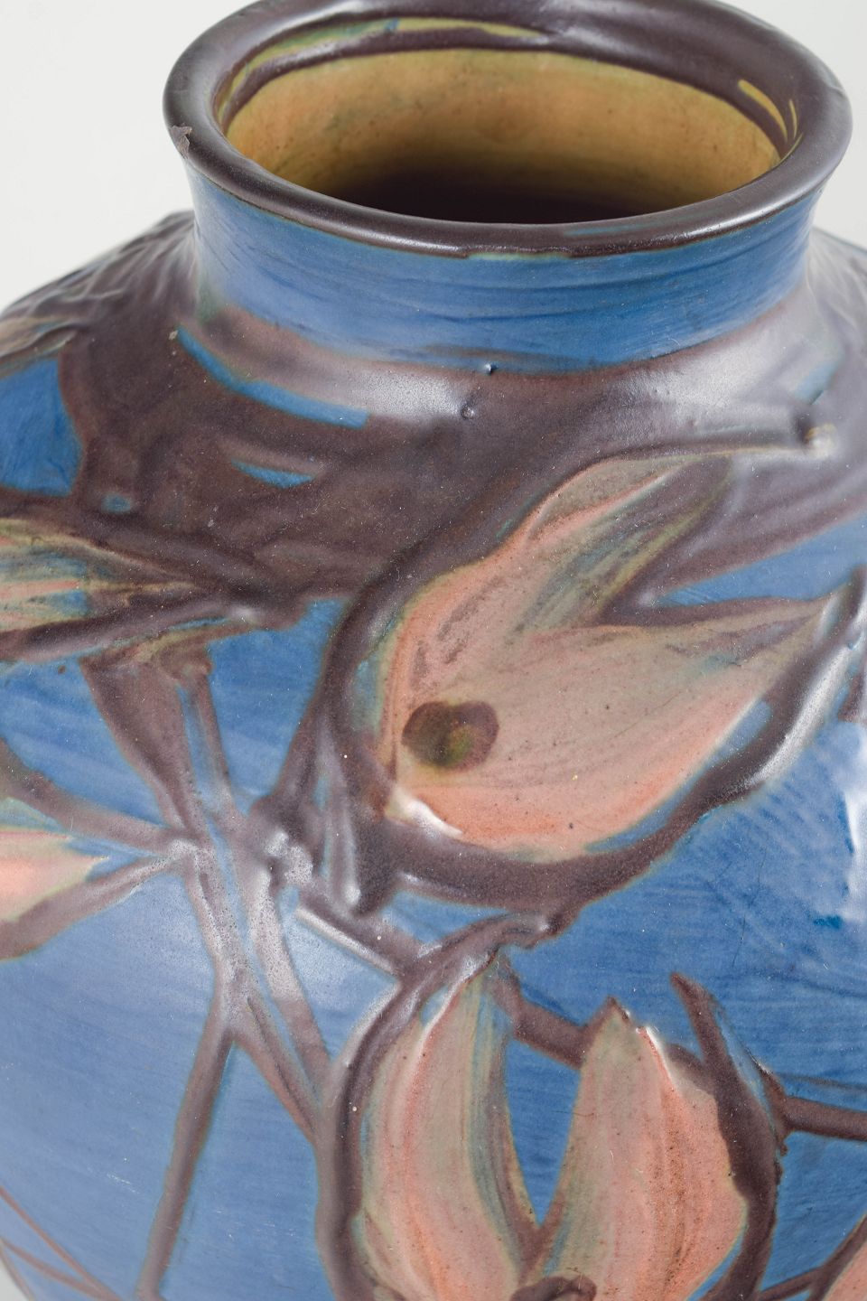 Stor hånddrejet vase i glaseret stentøj med karakteristisk dybblå bundglasur og hånddekoreret blomsterornamentik i rosa og brunlige nuancer – typisk for Kählers dekorative værkstedsproduktion i første halvdel af 1900-tallet. Monumental og skulpturel tilstedeværelse.