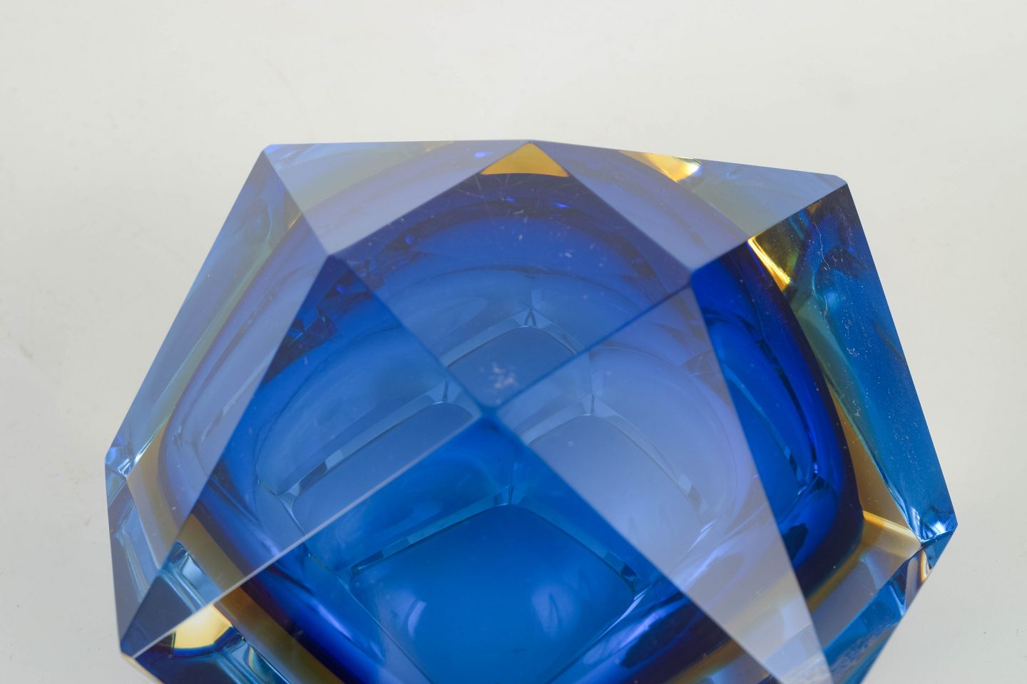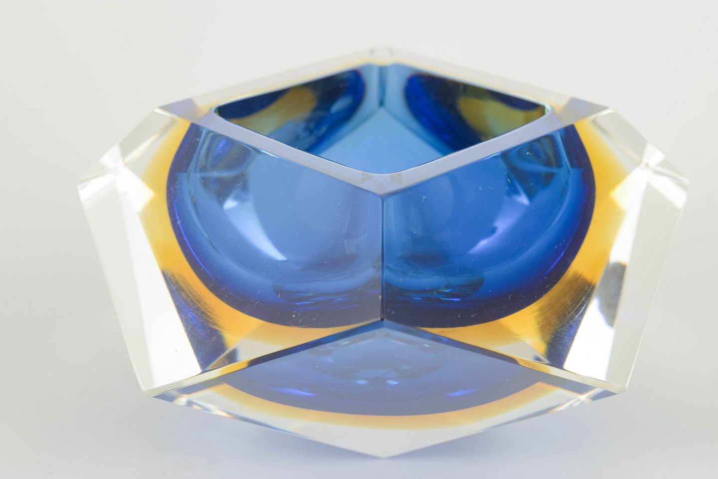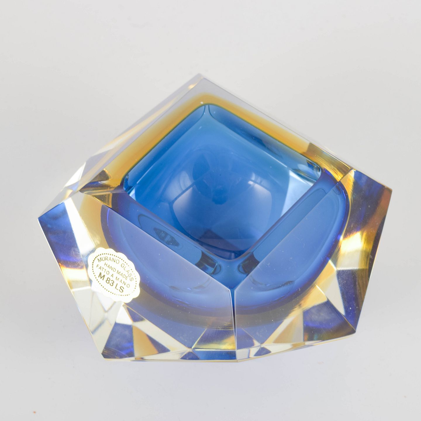 Tung og geometrisk facetslebet skål i massivt Murano-krystalglas med lagvis farveoptik i blå og gyldne nuancer – klassisk for italiensk Sommerso-teknik fra 1970’erne.