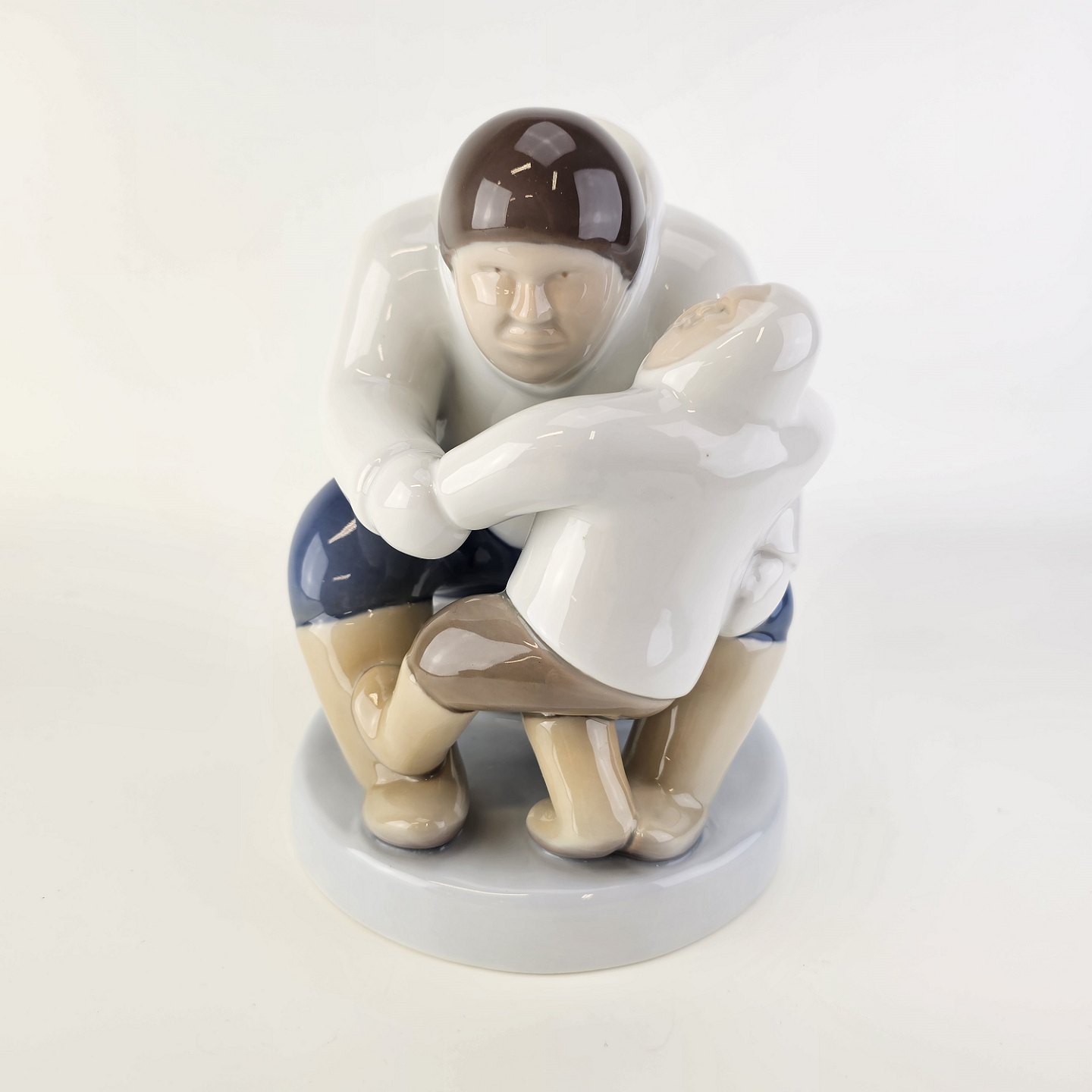Figur i porcelæn med motiv af en grønlænder med et barn