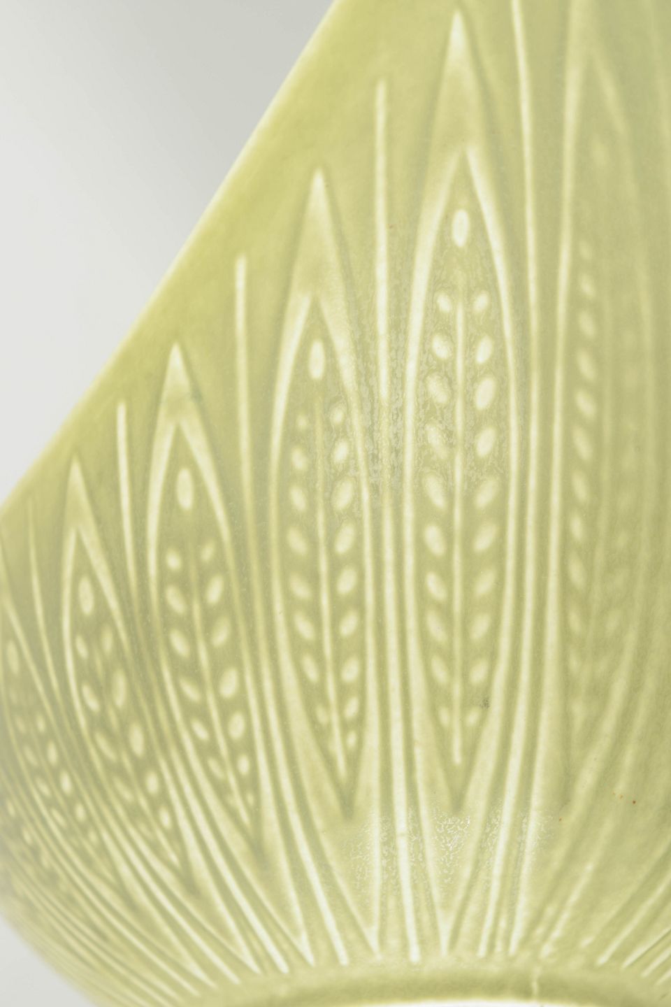 Sculpturel og organisk formet skål fra serien Rialto, med karakteristisk reliefmønster og blank olivengrøn glasur. En elegant og tidstypisk repræsentation af Rörstrands design fra midten af det 20. århundrede.