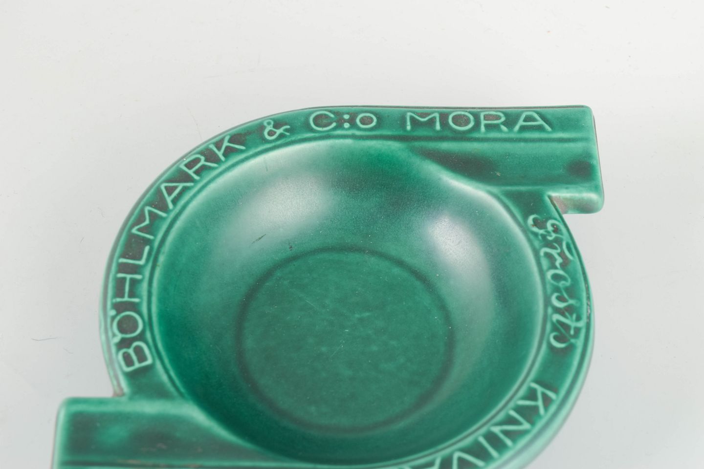 Keramisk reklame-askebæger med indpresset tekst BÖHLMARK & C:o, MORA, Frosts KNIVAR”. Klassisk Art Deco-form med grøn glasur og reliefdetaljer.