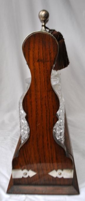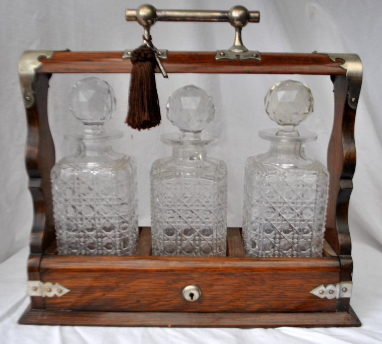 Engelsk tantalus med tre krystal karafler, 19. årh. Poleret egetræ. Med forsølvede beslag og lås med nøgle. H: 34 cm. L: 38 cm.