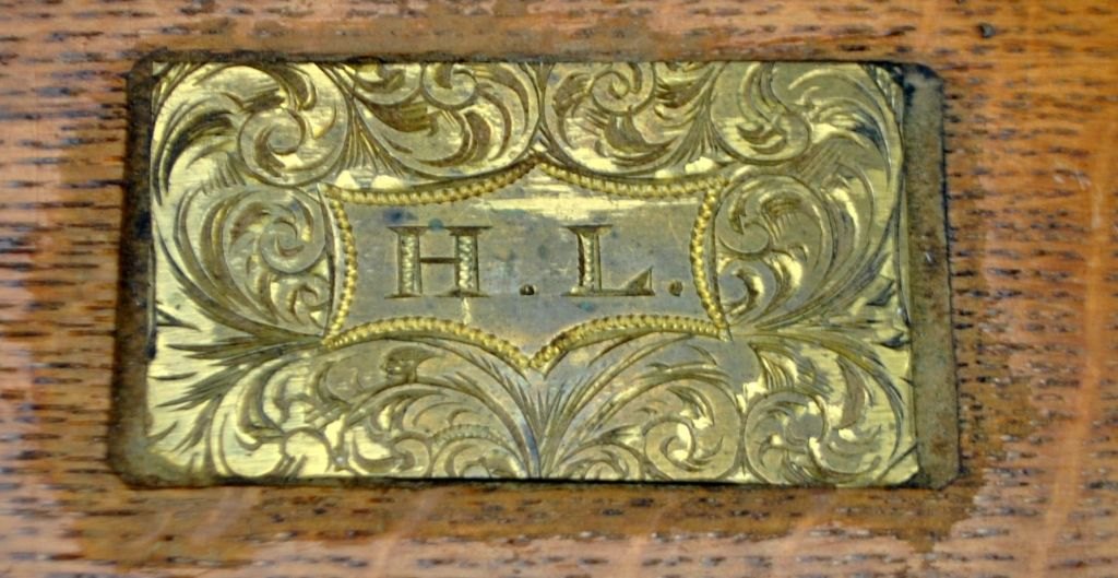 Engelsk tantalus med tre krystal karafler, 19. årh. Poleret egetræs skrin med lås og nøgleskilt. Indeholdende tre karafler med prop. Stemplet. H: 27 cm. L: 30 cm.