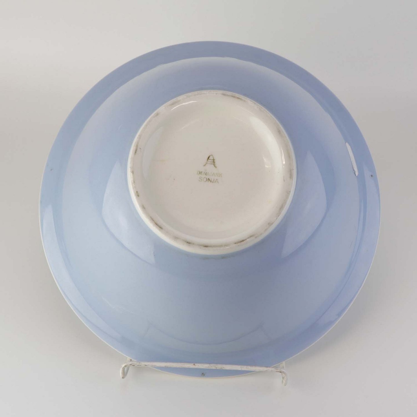 Service i lyseblå fajance dekoreret med tynd hvid kant.