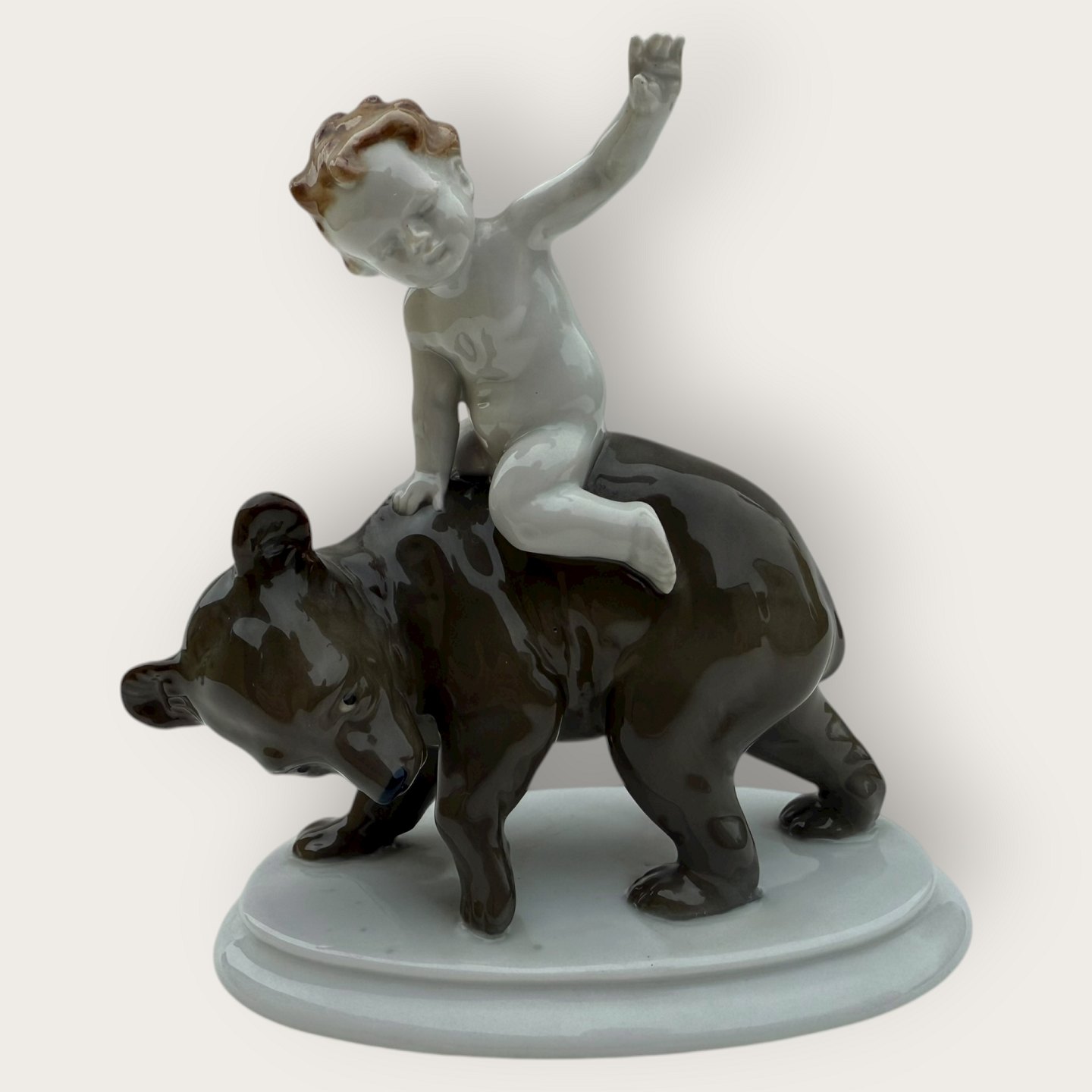 Metzler & Ortloff, Dreng på bjørn, ca. 12x14,5cm *fin stand*