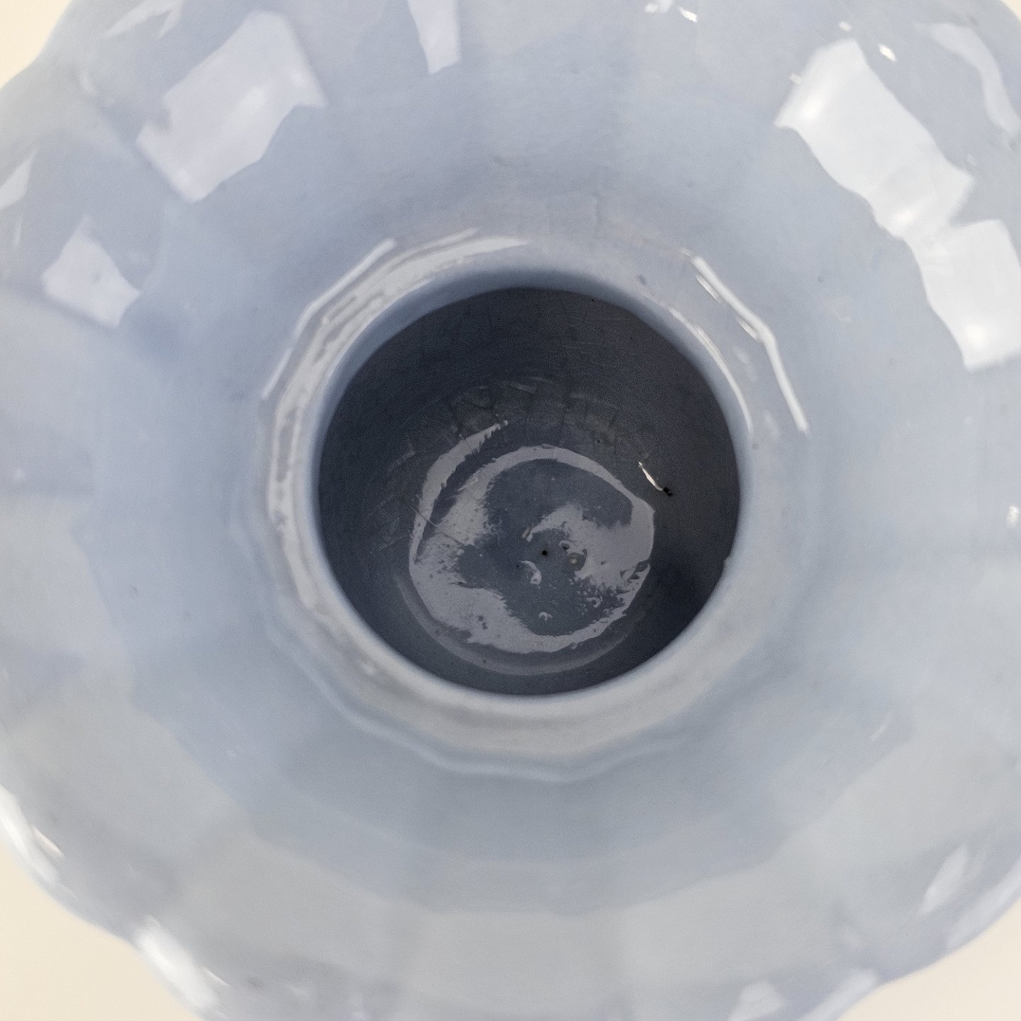 Fremstår med krakeleringer i glasuren og en misfarvning under bunden