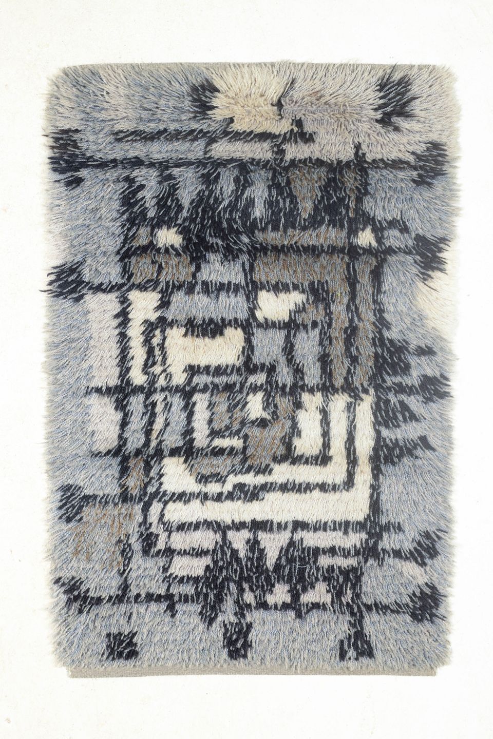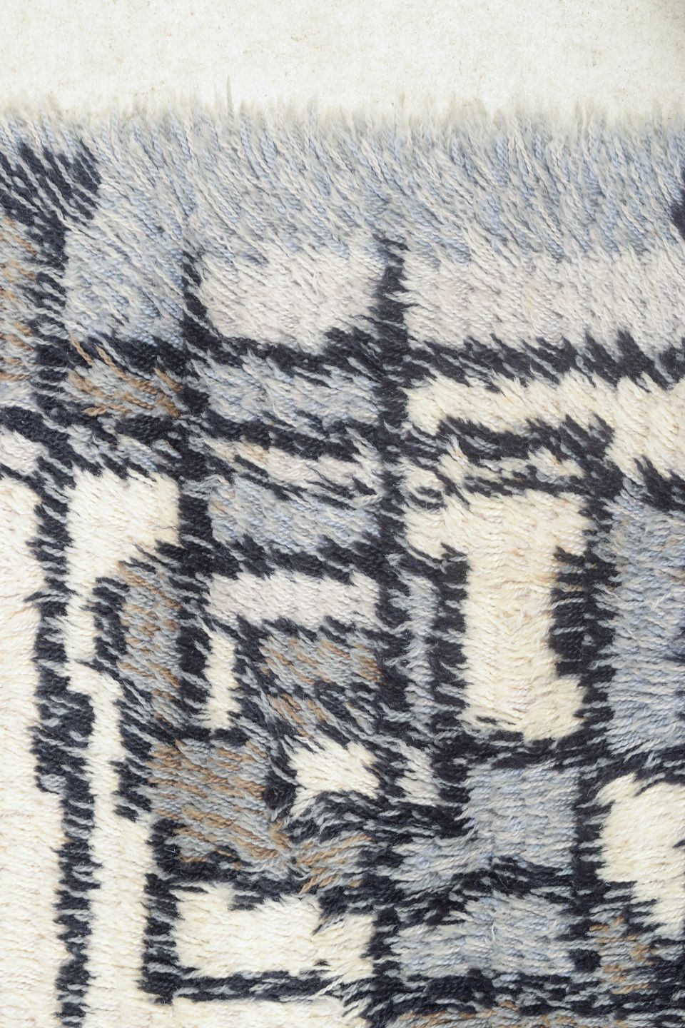 Håndknyttet rya-tæppe i uld med geometrisk mønster i sort, grå og cremefarvede toner. Et tidstypisk design med grafisk karakter og afbalanceret farvespil, som afspejler periodens modernistiske tilgang til tekstilkunst.