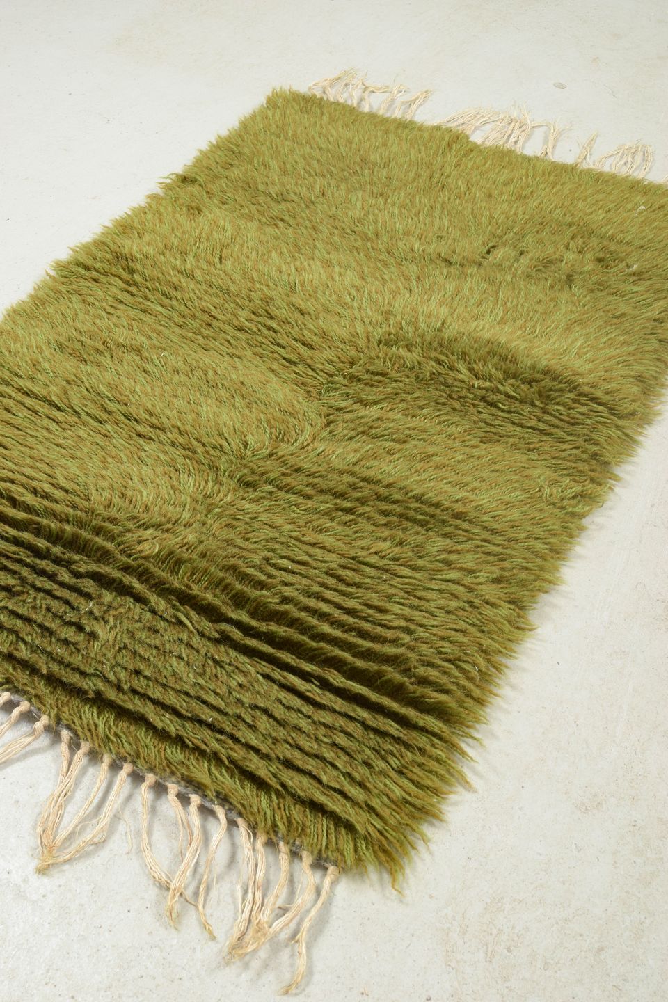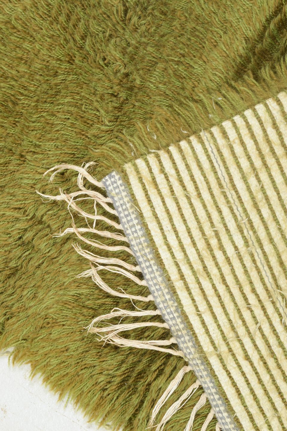 Håndknyttet rya-tæppe i ren uld i olivengrøn nuance med ensfarvet, strukturel overflade. Et enkelt og elegant eksempel på skandinavisk tekstildesign fra perioden, hvor farve og tekstur fremhævede materialets naturlige kvaliteter.