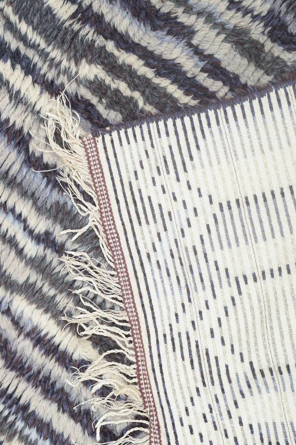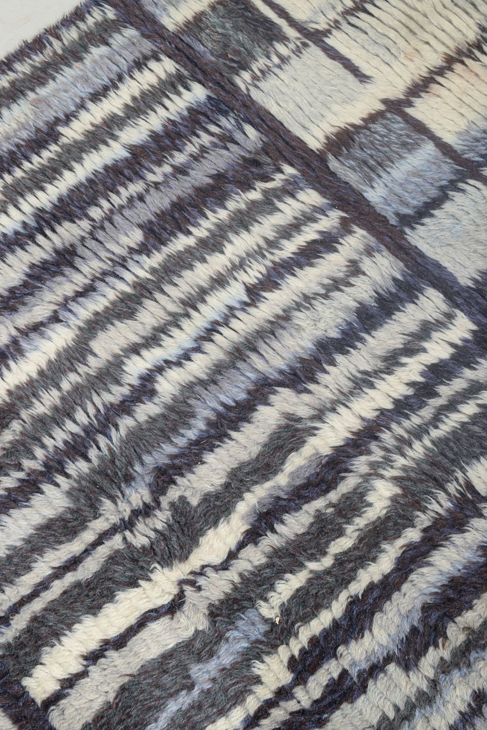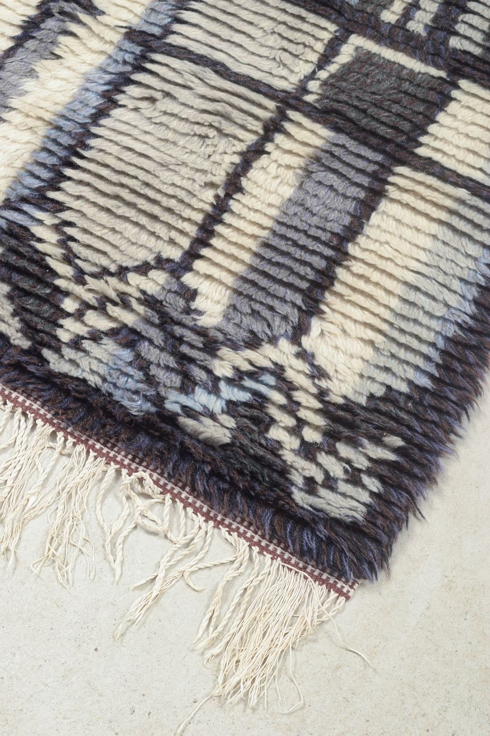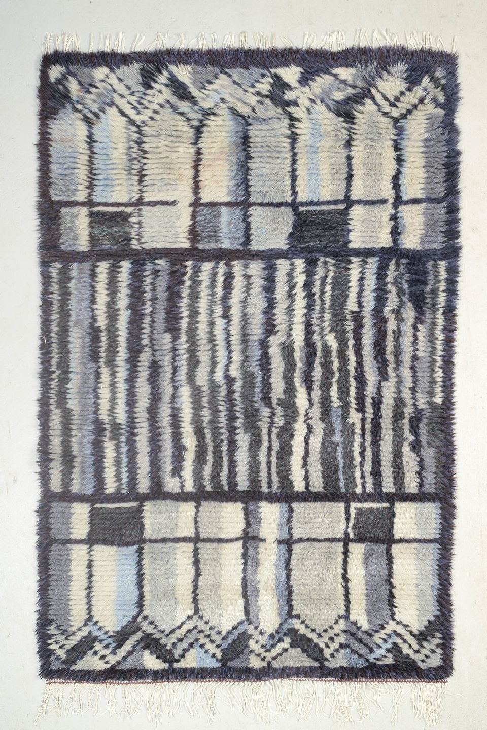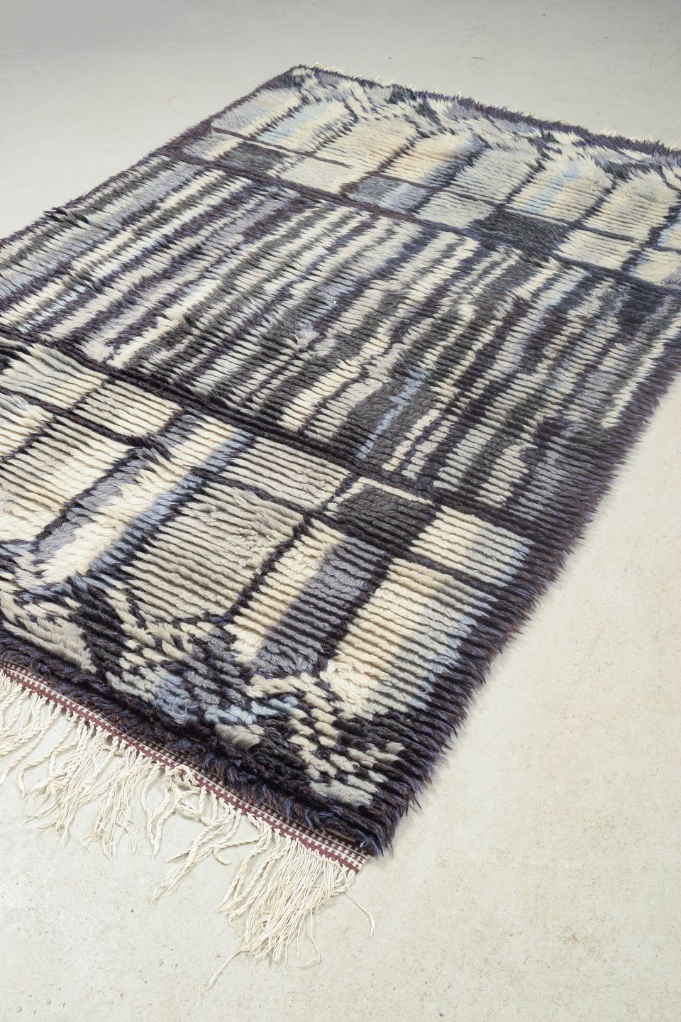 Håndknyttet rya-tæppe i uld med grafisk mønster i blå, grå og cremefarvede nuancer. Tæppets rytmiske komposition og geometriske formsprog er karakteristisk for skandinavisk tekstildesign i perioden, hvor traditionelt håndværk blev forenet med modernistisk æstetik.