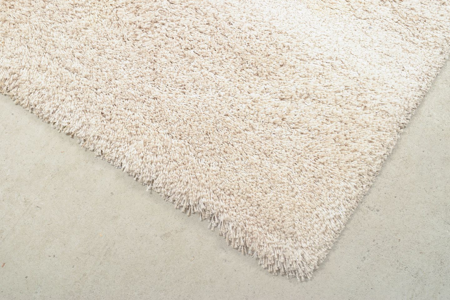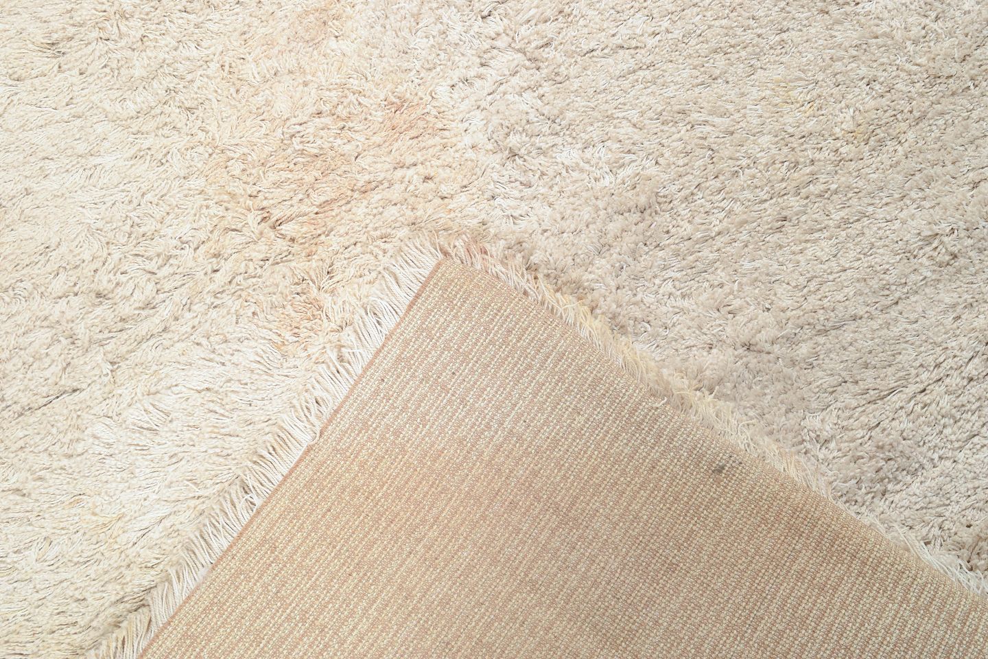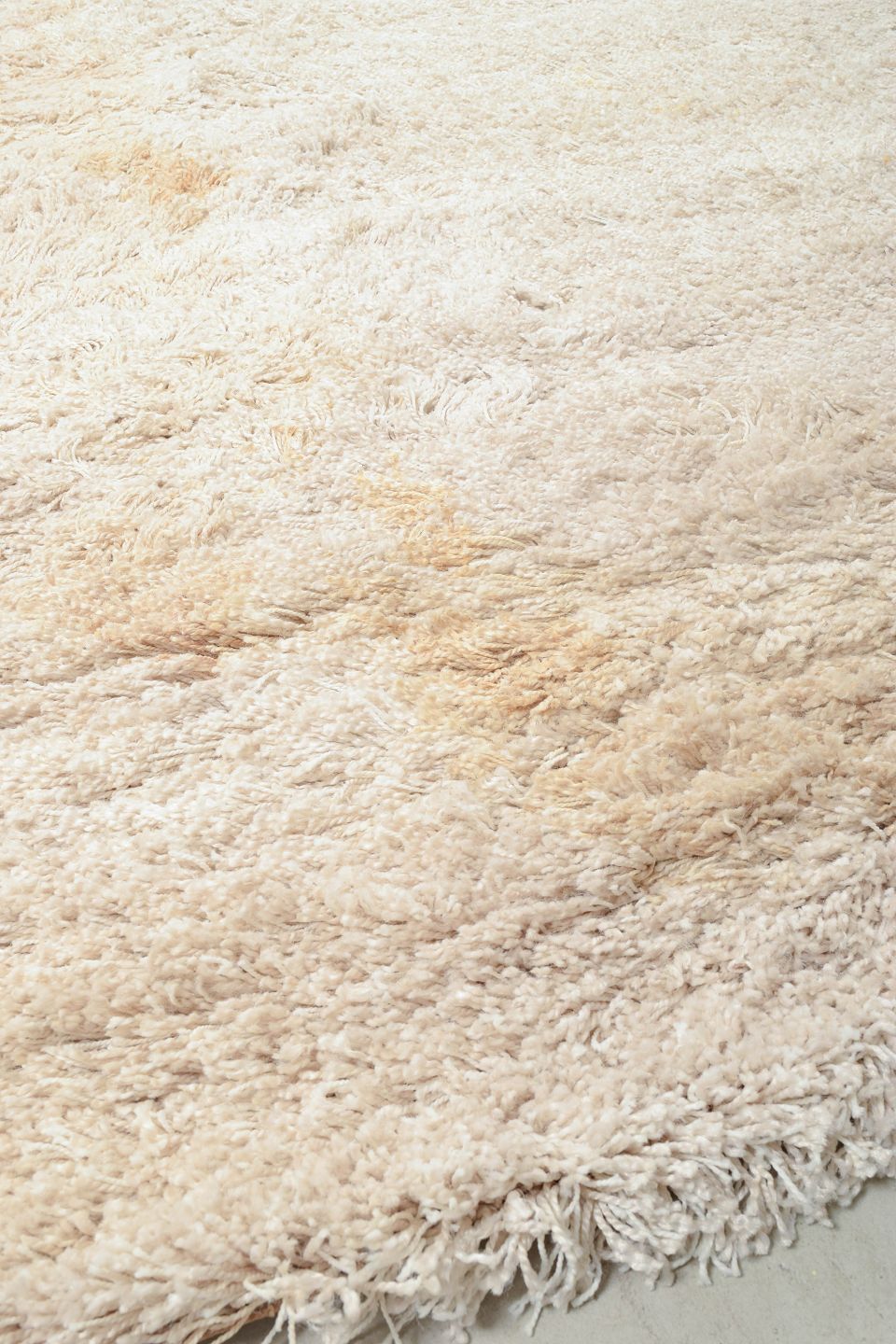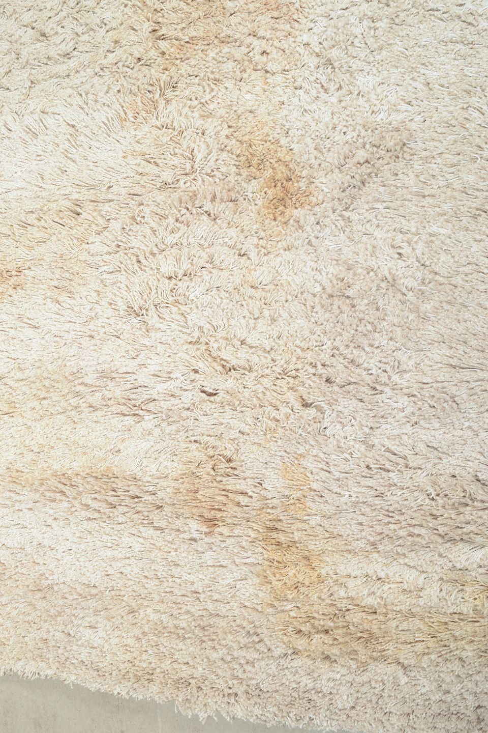 Stort rya-tæppe i lys uld med tæt luv og enkel, ensfarvet struktur. Et klassisk skandinavisk design fra perioden, hvor fokus var på tekstur og materialefornemmelse. Tæppet har pletter og lugtgener på bagsiden, hvilket afspejles i standangivelsen.